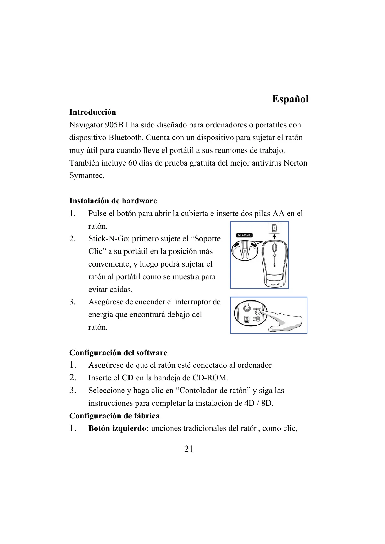 Español Introducción Navigator 905BT ha sido diseñado para ordenadores o portátiles con dispositivo Bluetooth. Cuenta con un dispositivo para sujetar el ratón muy útil para cuando lleve el portátil a sus reuniones de trabajo. También incluye 60 días de prueba gratuita del mejor antivirus Norton Symantec. Instalación de hardware