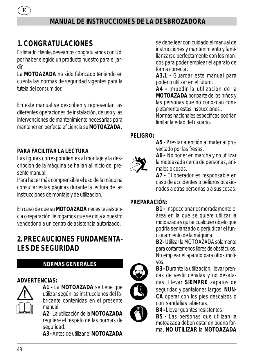 A1 - La MOTOAZADA se tiene que utilizar según las instrucciones del fabricante contenidas en el presente manual. A2 - La utilización de la MOTOAZADA requiere el respeto de las normas de seguridad. A3 - Antes de utilizar el MOTOAZADA 48