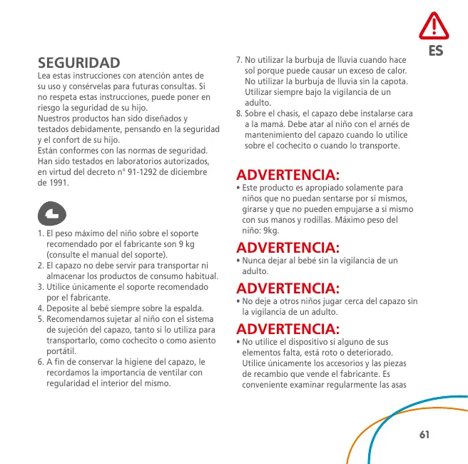 SEGURIDAD Lea estas instrucciones con atención antes de su uso y consérvelas para futuras consultas. Si no respeta estas instrucciones, puede poner en riesgo la seguridad de su hijo. Nuestros productos han sido diseñados y testados debidamente, pensando en la seguridad y el confort de su hijo. Están conformes con las normas de seguridad. Han sido testados en laboratorios autorizados, en virtud del decreto n° 91-1292 de diciembre de 1991.