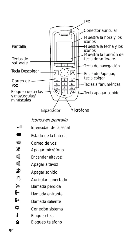 Pantalla Teclas de LED Conector auricular 5] L° Muestra la hora y los iconos Muestra la fecha yllos iconos Muestra la funciôn de tecla de software software TT || _-Tecia de navegaciôn Tecia Descolgar — 5") encenderiapagar. = tecla colgar Correo de ——f# | voz Es eds alfanuméricas Bloqueo de teclas —T Tecla apagar sonido y mayésculas/ Minscules Espaciädor Micréfono Ionos en pantalla