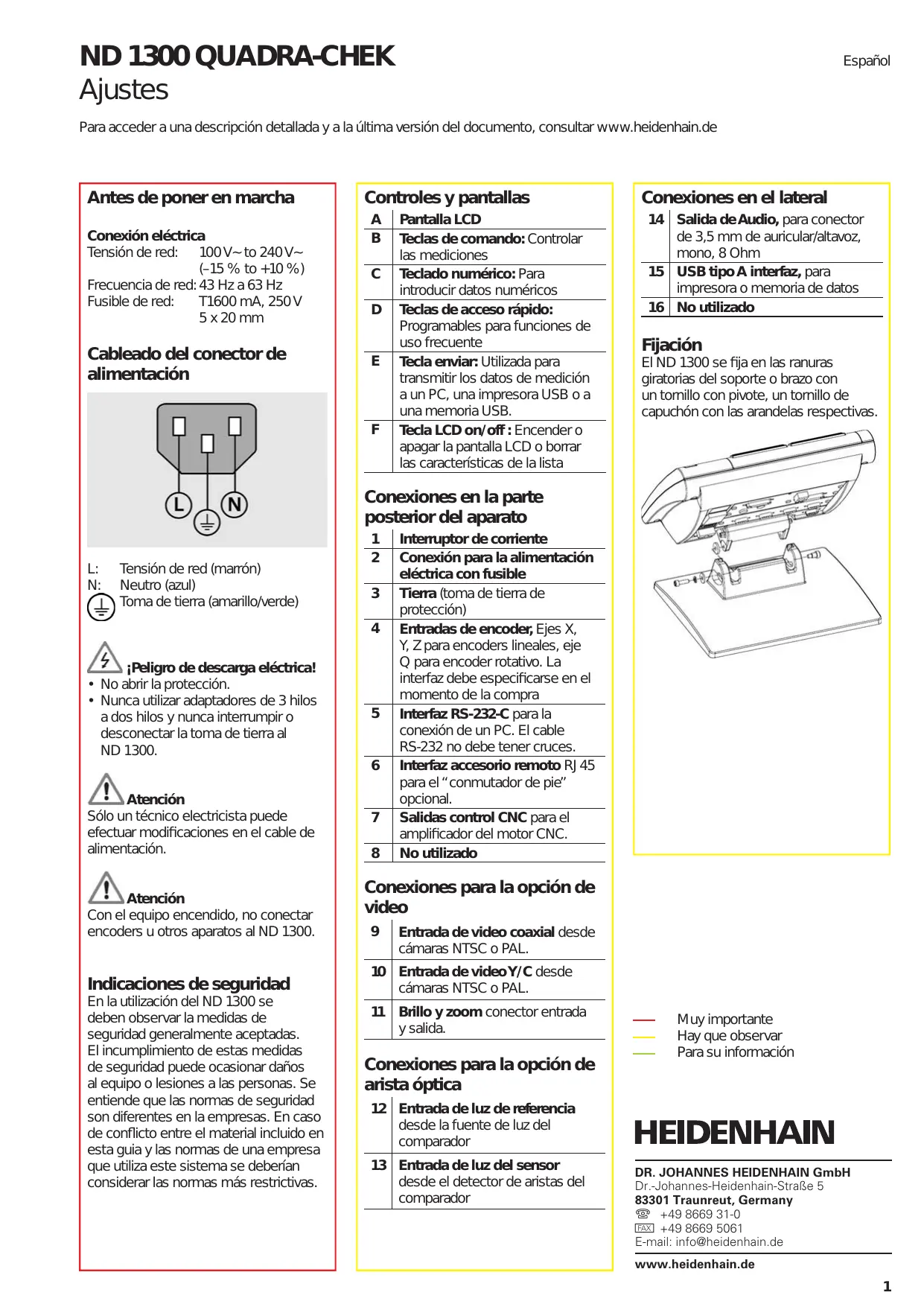 Para acceder a una descripción detallada y a la última versión del documento, consultar www.heidenhain.de Antes de poner en marcha Conexión eléctrica Tensión de red: 100 V~ to 240 V~ (–15 % to +10 %) Frecuencia de red: 43 Hz a 63 Hz Fusible de red: T1600 mA, 250 V 5 x 20 mm Cableado del conector de alimentación Controles y pantallas