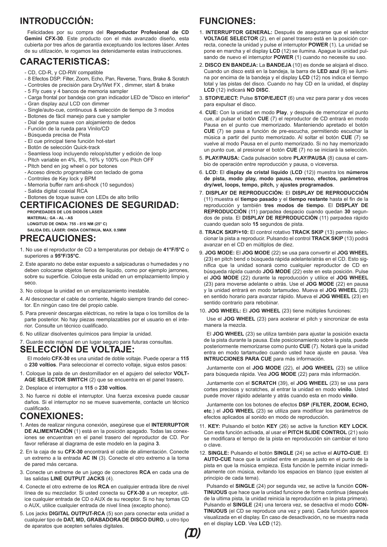 Felicidades por su compra del Reproductor Profesional de CD Gemini CFX-30. Este producto con el más avanzado diseño, esta cubierta por tres años de garantía exceptuando los lectores láser. Antes de su utilización, le rogamos lea detenidamente estas instrucciones. CARACTERISTICAS: - CD, CD-R, y CD-RW compatible - 8 Efectos DSP: Filter, Zoom, Echo, Pan, Reverse, Trans, Brake & Scratch - Controles de precisión para Dry/Wet FX , dimmer, start & brake - 5 Fly cues y 4 bancos de memoria sampler - Carga frontal por bandeja con gran indicador LED de "Disco en interior" - Gran display azul LCD con dimmer - Single/auto-cue, continuous & selección de tiempo de 3 modos - Botones de fácil manejo para cue y sampler - Dial de goma suave con alojamiento de dedos - Función de la rueda para Vinilo/CD - Búsqueda precisa de Pista - El cue principal tiene función hot-start - Botón de selección Quick-track - Seamless loop incluyendo reloop/stutter y edición de loop - Pitch variable en 4%, 8%, 16% y 100% con Pitch OFF - Pitch bend en jog wheel o por botones - Acceso directo programable con teclado de goma - Controles de Key lock y BPM - Memoria buffer ram anti-shock (10 segundos) - Salida digital coaxial RCA - Botones de toque suave con LEDs de alto brillo CERTIFICACIONES DE SEGURIDAD: