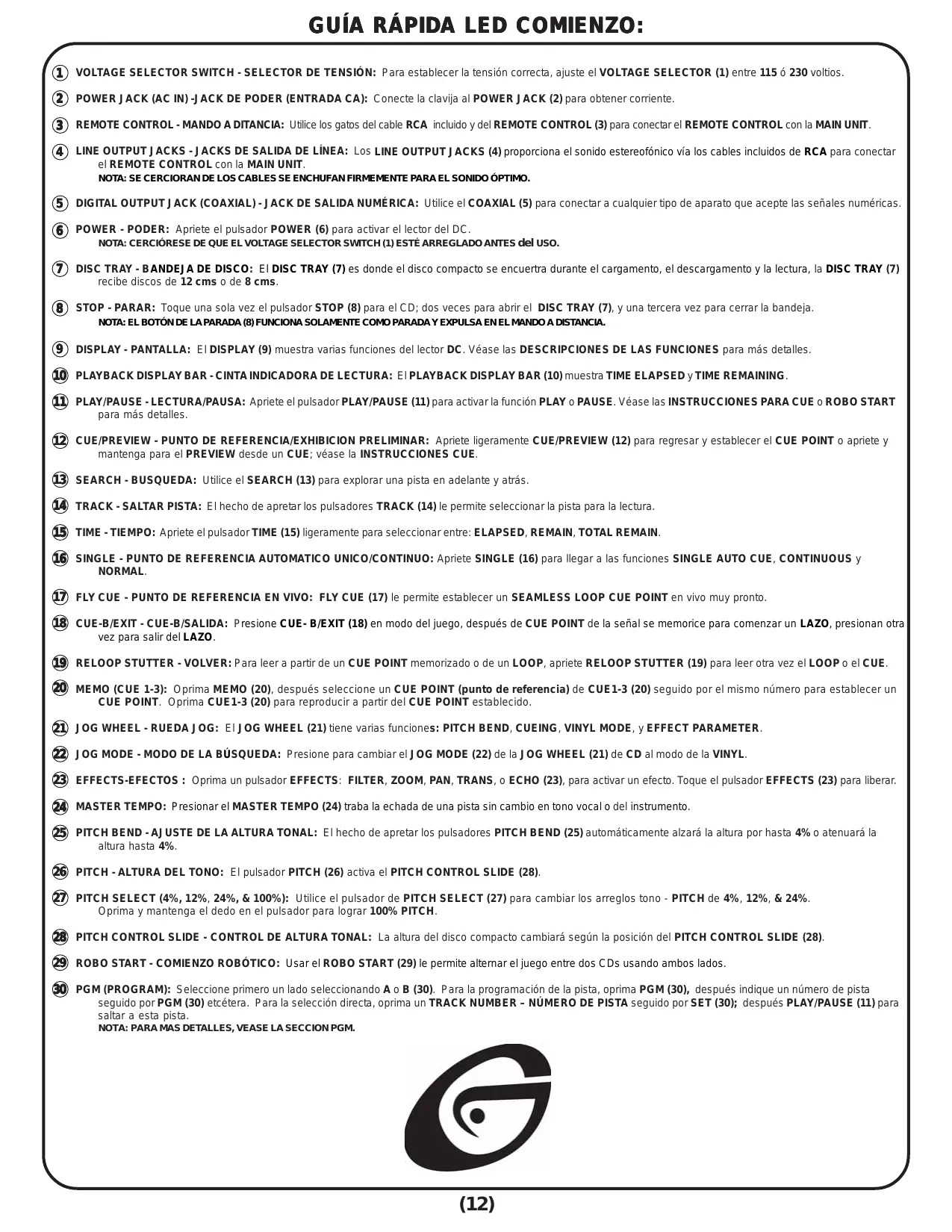 ROBO START: Apriete el pulsador ROBO START (29) para activar la función ROBO START (29) (el pulsador parpadea). Utilice ROBO START (29) en la MODALIDAD SINGLE-AUTO CUE para alternar entre los dos días del reproductor de discos compactos (una pista de un lado, después una pista del(othero lado). Véase las instrucciones ROBO START para más instructcciones.