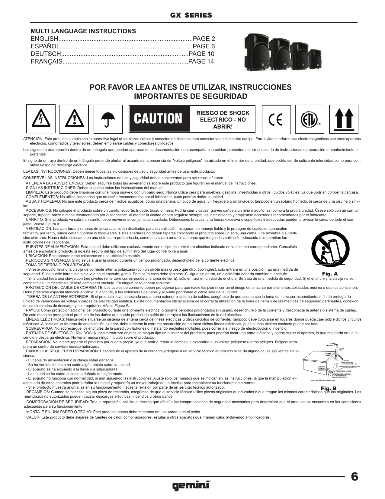 GX SERIES INTRODUCTION Felicidades por la compra de sus cajas acústicas Gemini GX Series. Su producto está amparado por 1 año de garantía limitada. Con el uso y mantenimiento adecuado sus altavoces le drán años de servicio. Por favor regristre su producto online en WWW.GEMNIDJ.COM o usando el formulario del final de este manual. CAUTIONS: