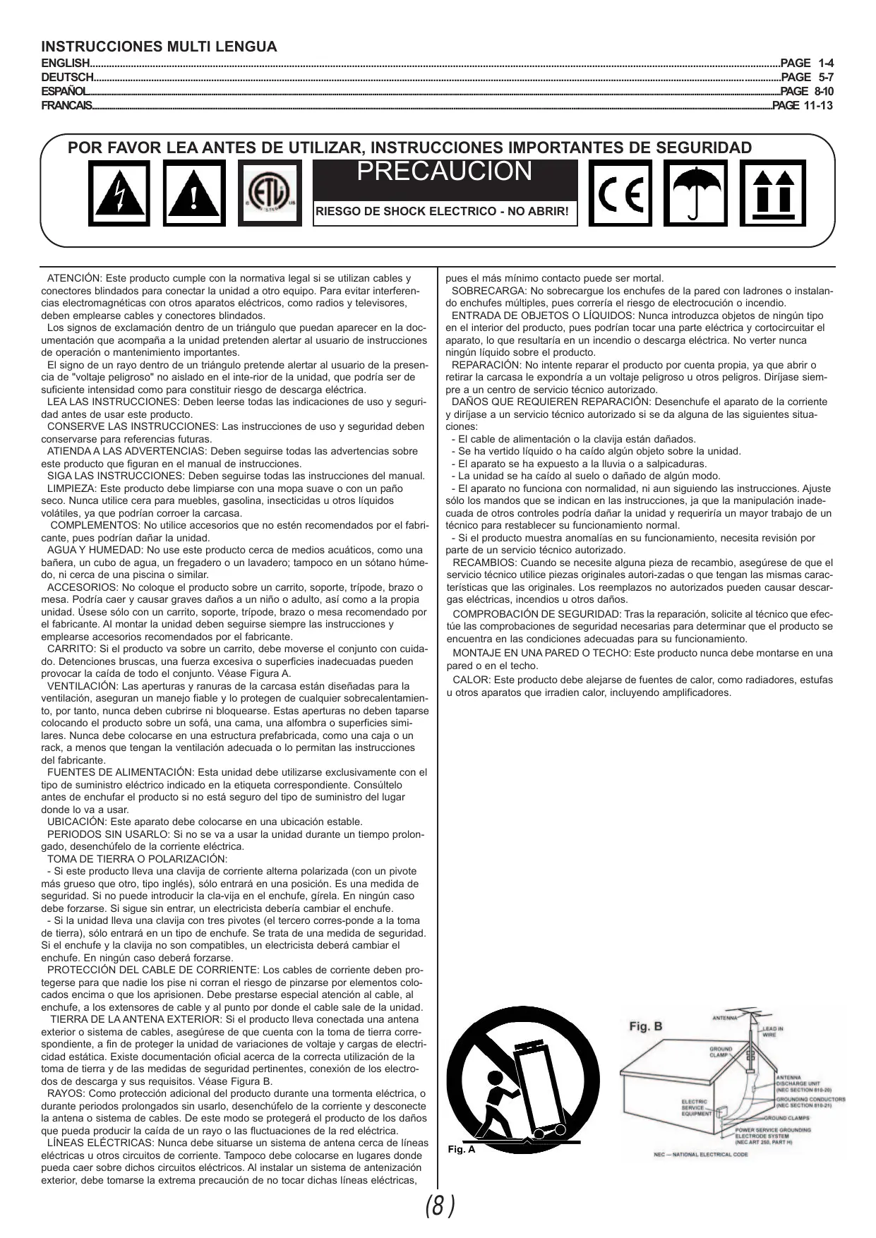 ATIENDA A LAS ADVERTENCIAS: Deben seguirse todas las advertencias sobre este producto que figuran en el manual de instrucciones. SIGA LAS INSTRUCCIONES: Deben seguirse todas las instrucciones del manual. - Si este producto lleva una clavija de corriente alterna polarizada (con un pivote más grueso que otro, tipo inglés), sólo entrará en una posición. Es una medida de seguridad. Si no puede introducir la cla-vija en el enchufe, gírela. En ningún caso debe forzarse. Si sigue sin entrar, un electricista debería cambiar el enchufe. - Si la unidad lleva una clavija con tres pivotes (el tercero corres-ponde a la toma de tierra), sólo entrará en un tipo de enchufe. Se trata de una medida de seguridad. Si el enchufe y la clavija no son compatibles, un electricista deberá cambiar el enchufe. En ningún caso deberá forzarse. PROTECCIÓN DEL CABLE DE CORRIENTE: Los cables de corriente deben protegerse para que nadie los pise ni corran el riesgo de pinzarse por elementos colocados encima o que los aprisionen. Debe prestarse especial atención al cable, al enchufe, a los extensores de cable y al punto por donde el cable sale de la unidad. TIERRA DE LA ANTENA EXTERIOR: Si el producto lleva conectada una antena exterior o sistema de cables, asegúrese de que cuenta con la toma de tierra correspondiente, a fin de proteger la unidad de variaciones de voltaje y cargas de electricidad estática. Existe documentación oficial acerca de la correcta utilización de la toma de tierra y de las medidas de seguridad pertinentes, conexión de los electrodos de descarga y sus requisitos. Véase Figura B. RAYOS: Como protección adicional del producto durante una tormenta eléctrica, o durante periodos prolongados sin usarlo, desenchúfelo de la corriente y desconecte la antena o sistema de cables. De este modo se protegerá el producto de los daños que pueda producir la caída de un rayo o las fluctuaciones de la red eléctrica. LÍNEAS ELÉCTRICAS: Nunca debe situarse un sistema de antena cerca de líneas eléctricas u otros circuitos de corriente. Tampoco debe colocarse en lugares donde pueda caer sobre dichos circuitos eléctricos. Al instalar un sistema de antenización exterior, debe tomarse la extrema precaución de no tocar dichas líneas eléctricas,
