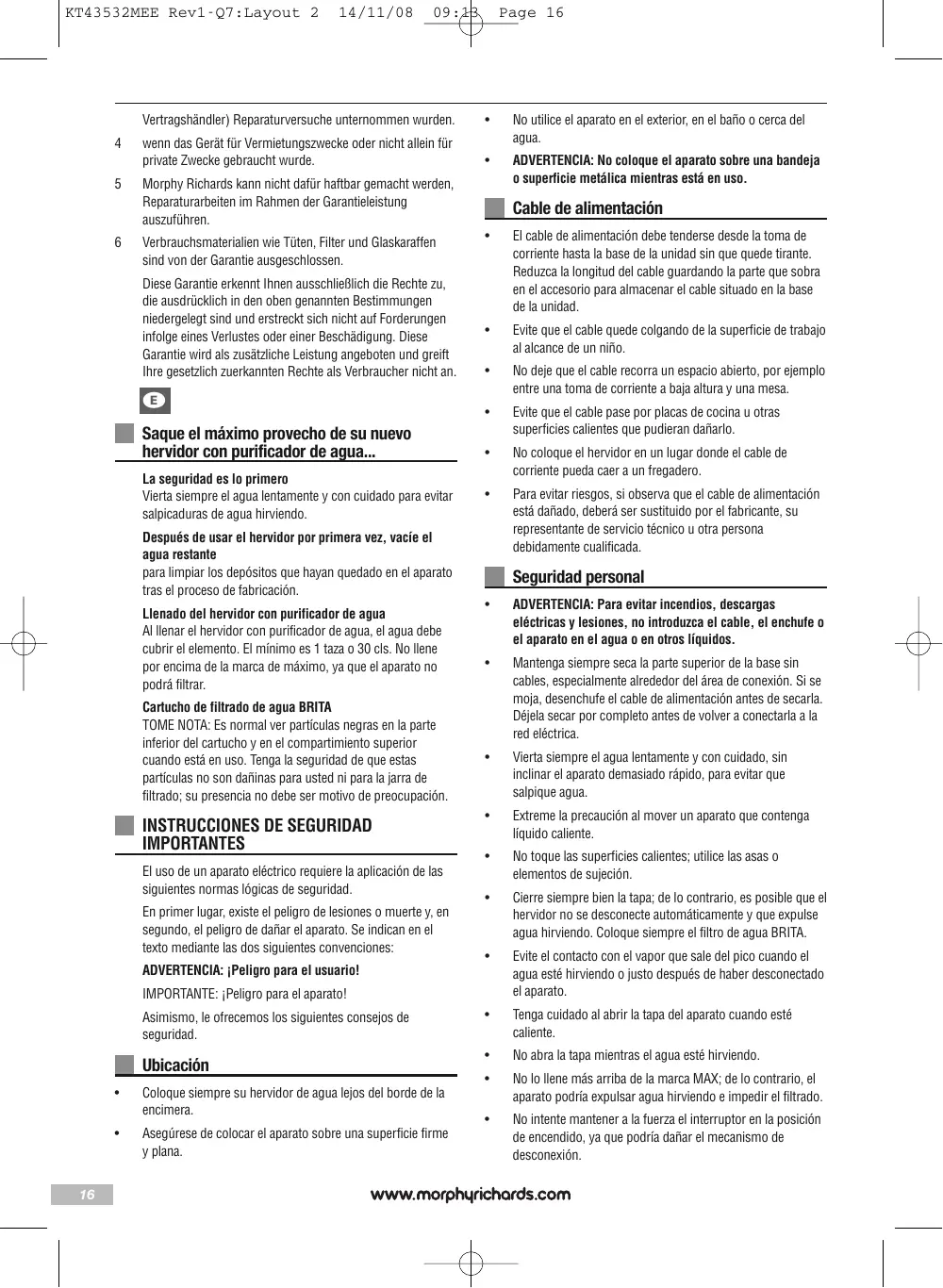 Los filtros de plástico para todos los calentadores y cafeteras de Morphy Richards no están cubiertos por la garantía. Esta garantía no confiere derechos distintos de los expuestos anteriormente y no cubre ninguna reclamación por las pérdidas o daños resultantes. Esta garantía se ofrece como ventaja adicional y no afecta a sus derechos legales como consumidor.