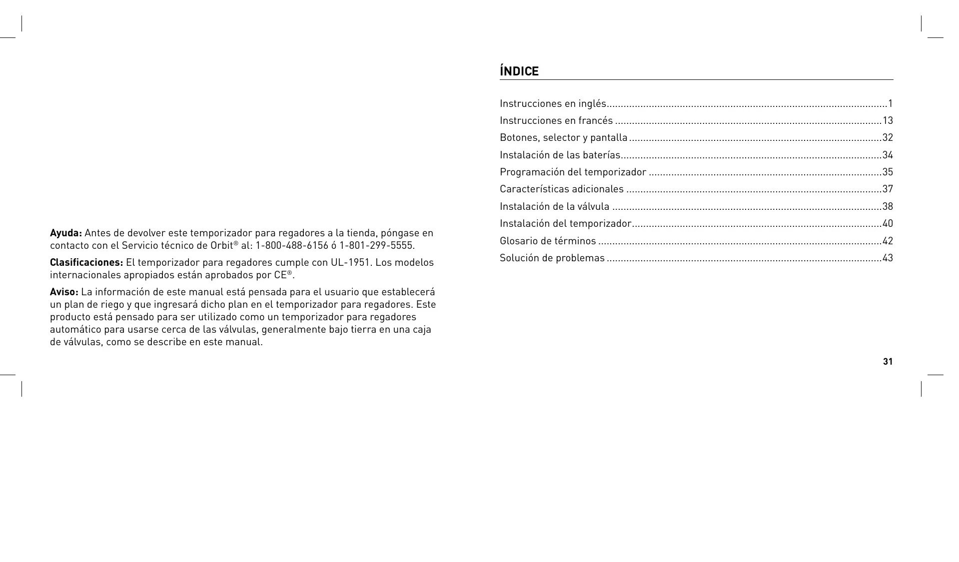 - Instalación de la válvula Ayuda: Antes de devolver este temporizador para regadores a la tienda, póngase en contacto con el Servicio técnico de Orbit® al: 1-800-488-6156 ó 1-801-299-5555. Clasificaciones: El temporizador para regadores cumple con UL-1951. Los modelos internacionales apropiados están aprobados por CE®. Aviso: La información de este manual está pensada para el usuario que establecerá un plan de riego y que ingresará dicho plan en el temporizador para regadores. Este producto está pensado para ser utilizado como un temporizador para regadores automático para usarse cerca de las válvulas, generalmente bajo tierra en una caja de válvulas, como se describe en este manual. p. 38