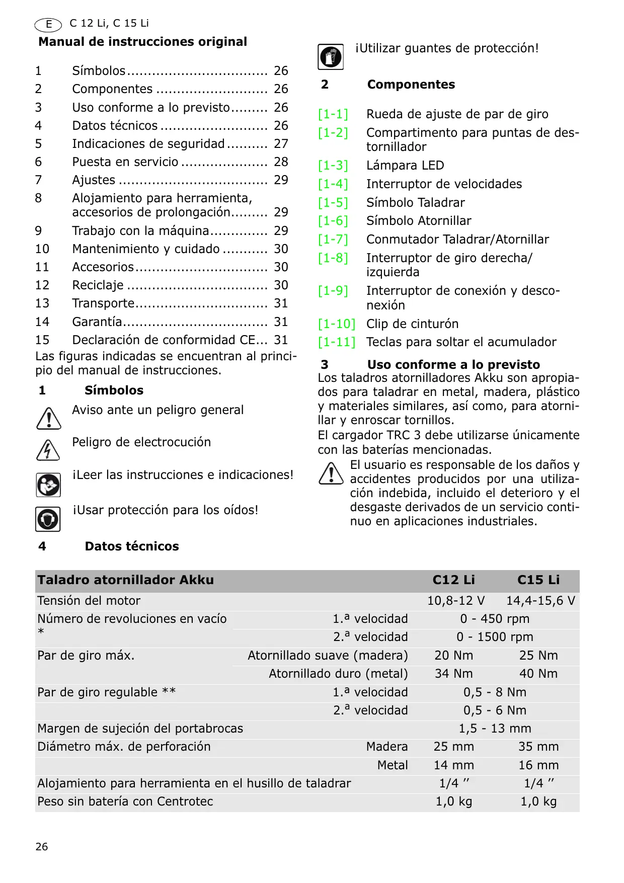 Componentes [1-1] Compartimento para puntas de destornillador [1-3] Lámpara LED [1-4] Interruptor de giro derecha/ izquierda Interruptor de conexión y desconexión [1-9] [1-10] Clip de cinturón [1-11] Teclas para soltar el acumulador Uso conforme a lo previsto Los taladros atornilladores Akku son apropiados para taladrar en metal, madera, plástico y materiales similares, así como, para atornillar y enroscar tornillos. El cargador TRC 3 debe utilizarse únicamente con las baterías mencionadas. El usuario es responsable de los daños y accidentes producidos por una utilización indebida, incluido el deterioro y el desgaste derivados de un servicio continuo en aplicaciones industriales. Datos técnicos Taladro atornillador Akku Tensión del motor Número de revoluciones en vacío