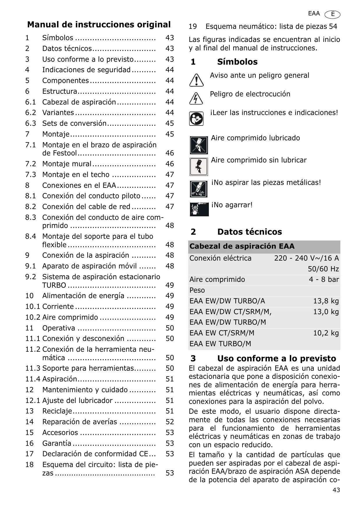 Montaje 45 7.1 Montaje en el brazo de aspiración de Festool 46 7.2 Montaje mural 46 7.3 Montaje en el techo 47 8 Conexiones en el EAA 47 8.1 Conexión del conducto piloto 47 8.2 Conexión del cable de red 47 8.3 Conexión del conducto de aire comprimido 48 8.4 Montaje del soporte para el tubo flexible 48 9 Conexión de la aspiración 48 9.1 Aparato de aspiración móvil 48 9.2 Sistema de aspiración estacionario TURBO 49 10 Alimentación de energía 49 10.1 Corriente 49 10.2 Aire comprimido 49 11 Operativa 50 11.1 Conexión y desconexión 50 11.2 Conexión de la herramienta neumática 50 11.3 Soporte para herramientas 50 11.4 Aspiración 51 12 Mantenimiento y cuidado 51 12.1 Ajuste del lubricador 51 13 Reciclaje 51 14 Reparación de averías 52 15 Accesorios 53 16 Garantía 53 17 Declaración de conformidad CE... 53 18 Esquema del circuito: lista de piezas 53