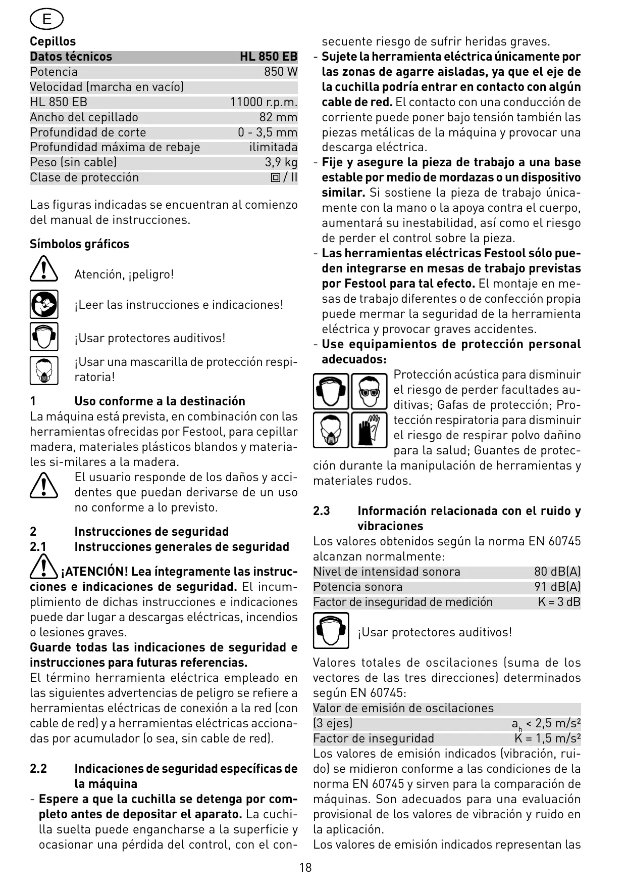Símbolos gráficos Atención, ¡peligro! ¡Leer las instrucciones e indicaciones! ¡Usar protectores auditivos! ¡Usar una mascarilla de protección respiratoria! 1 Uso conforme a la destinación La máquina está prevista, en combinación con las herramientas ofrecidas por Festool, para cepillar madera, materiales plásticos blandos y materiales si-milares a la madera. El usuario responde de los daños y accidentes que puedan derivarse de un uso no conforme a lo previsto. 2 2.1