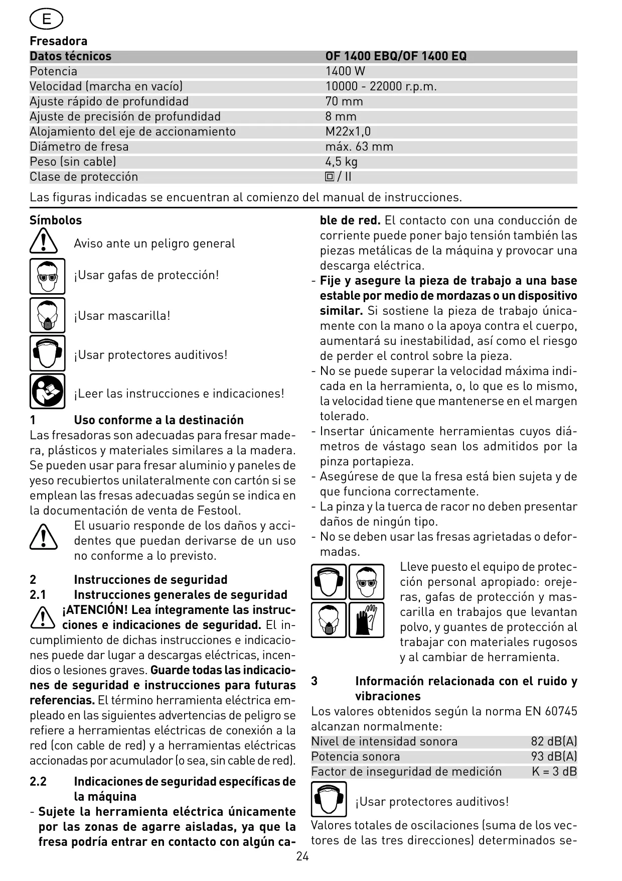 1400 W 10000 - 22000 r.p.m. 70 mm 8 mm M22x1,0 máx. 63 mm 4,5 kg / II Las figuras indicadas se encuentran al comienzo del manual de instrucciones. Símbolos Aviso ante un peligro general ¡Usar gafas de protección! ¡Usar mascarilla! ¡Usar protectores auditivos! ¡Leer las instrucciones e indicaciones! Uso conforme a la destinación Las fresadoras son adecuadas para fresar madera, plásticos y materiales similares a la madera. Se pueden usar para fresar aluminio y paneles de yeso recubiertos unilateralmente con cartón si se emplean las fresas adecuadas según se indica en la documentación de venta de Festool. El usuario responde de los daños y accidentes que puedan derivarse de un uso no conforme a lo previsto.