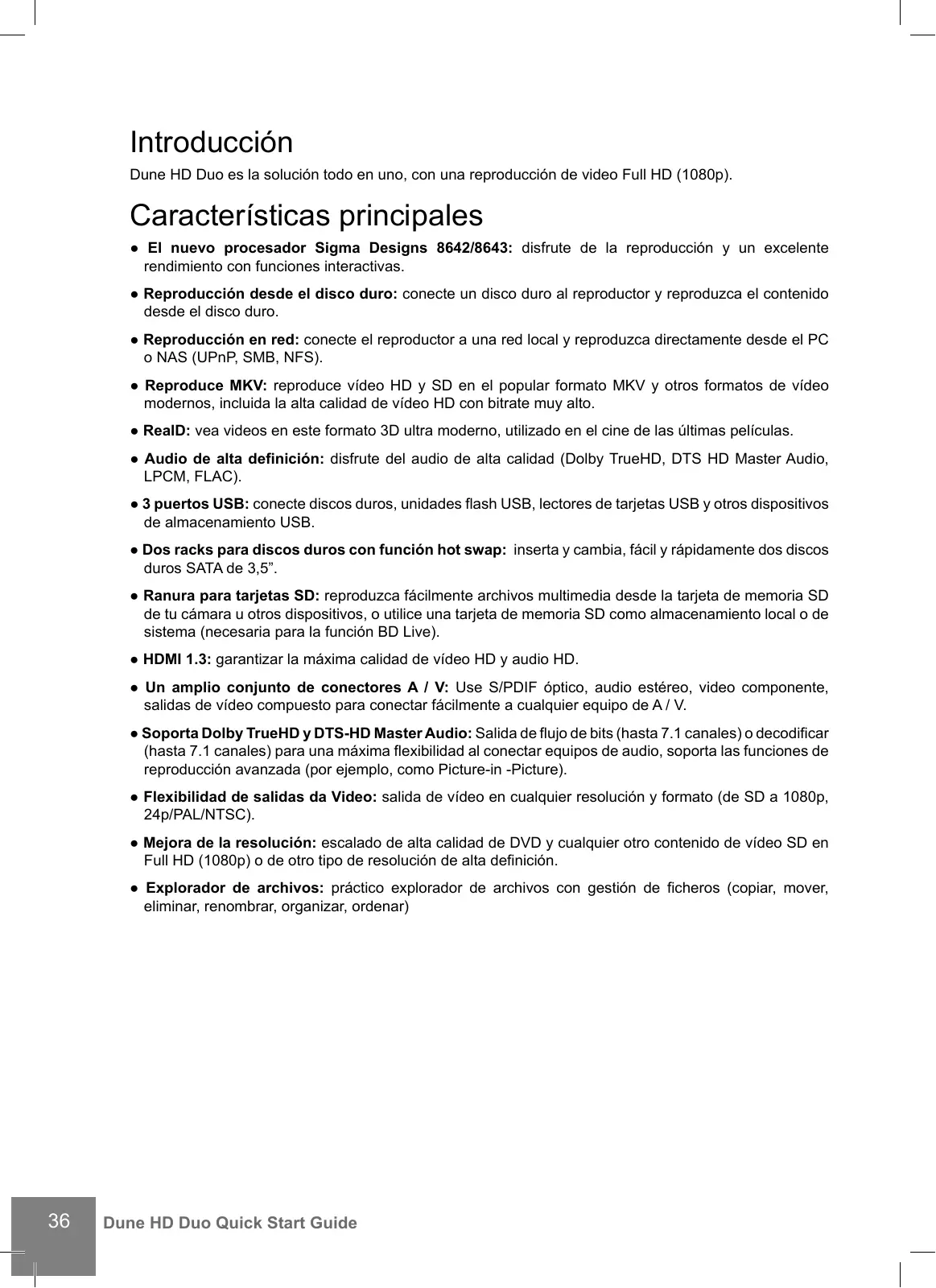 Introducción Dune HD Duo es la solución todo en uno, con una reproducción de video Full HD (1080p). Características principales ● El nuevo procesador Sigma Designs 8642/8643: disfrute de la reproducción y un excelente rendimiento con funciones interactivas. ● Reproducción desde el disco duro: conecte un disco duro al reproductor y reproduzca el contenido desde el disco duro. ● Reproducción en red: conecte el reproductor a una red local y reproduzca directamente desde el PC o NAS (UPnP, SMB, NFS). ● Reproduce MKV: reproduce vídeo HD y SD en el popular formato MKV y otros formatos de vídeo modernos, incluida la alta calidad de vídeo HD con bitrate muy alto. ● RealD: vea videos en este formato 3D ultra moderno, utilizado en el cine de las últimas películas. ● Audio de alta definición: disfrute del audio de alta calidad (Dolby TrueHD, DTS HD Master Audio, LPCM, FLAC). ● 3 puertos USB: conecte discos duros, unidades flash USB, lectores de tarjetas USB y otros dispositivos de almacenamiento USB. ● Dos racks para discos duros con función hot swap: inserta y cambia, fácil y rápidamente dos discos duros SATA de 3,5”. ● Ranura para tarjetas SD: reproduzca fácilmente archivos multimedia desde la tarjeta de memoria SD de tu cámara u otros dispositivos, o utilice una tarjeta de memoria SD como almacenamiento local o de sistema (necesaria para la función BD Live). ● HDMI 1.3: garantizar la máxima calidad de vídeo HD y audio HD. ● Un amplio conjunto de conectores A / V: Use S/PDIF óptico, audio estéreo, video componente, salidas de vídeo compuesto para conectar fácilmente a cualquier equipo de A / V. ● Soporta Dolby TrueHD y DTS-HD Master Audio: Salida de flujo de bits (hasta 7.1 canales) o decodificar (hasta 7.1 canales) para una máxima flexibilidad al conectar equipos de audio, soporta las funciones de reproducción avanzada (por ejemplo, como Picture-in -Picture). ● Flexibilidad de salidas da Video: salida de vídeo en cualquier resolución y formato (de SD a 1080p, 24p/PAL/NTSC). ● Mejora de la resolución: escalado de alta calidad de DVD y cualquier otro contenido de vídeo SD en Full HD (1080p) o de otro tipo de resolución de alta definición. ● Explorador de archivos: práctico explorador de archivos con gestión de ficheros (copiar, mover, eliminar, renombrar, organizar, ordenar)