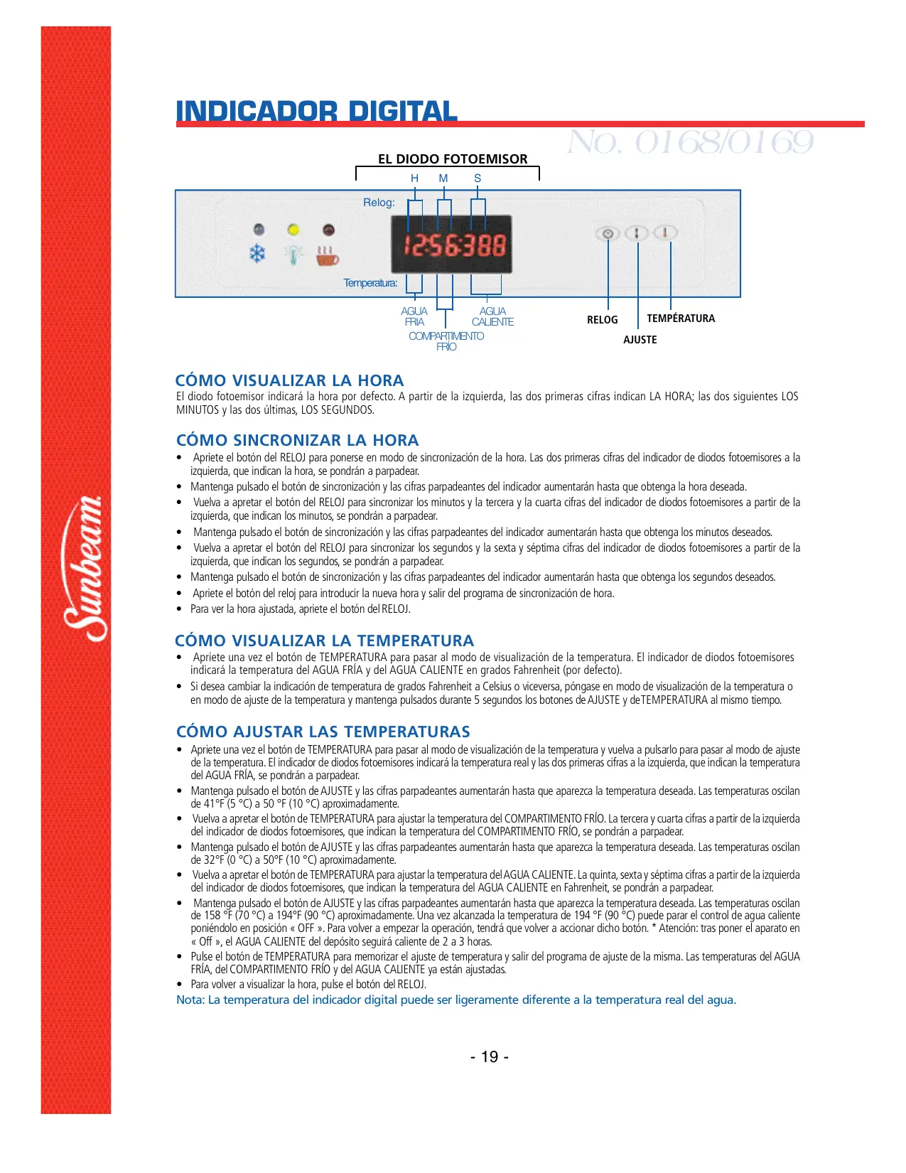 Felicidades! Acaba de comprar un distribuidor de agua embotellada SUNBEAM® de gran calidad. Sus numerousas caractécticas adiconiales son de lo más practicas, como la función de temperatura multiple que le permite Obtener agua fria o caliente. Basta con observar las sencillas instrucciones del presente manual para disfrutar sin problemas su distribuidor de agua durante muchos años. Léalas atentamente.