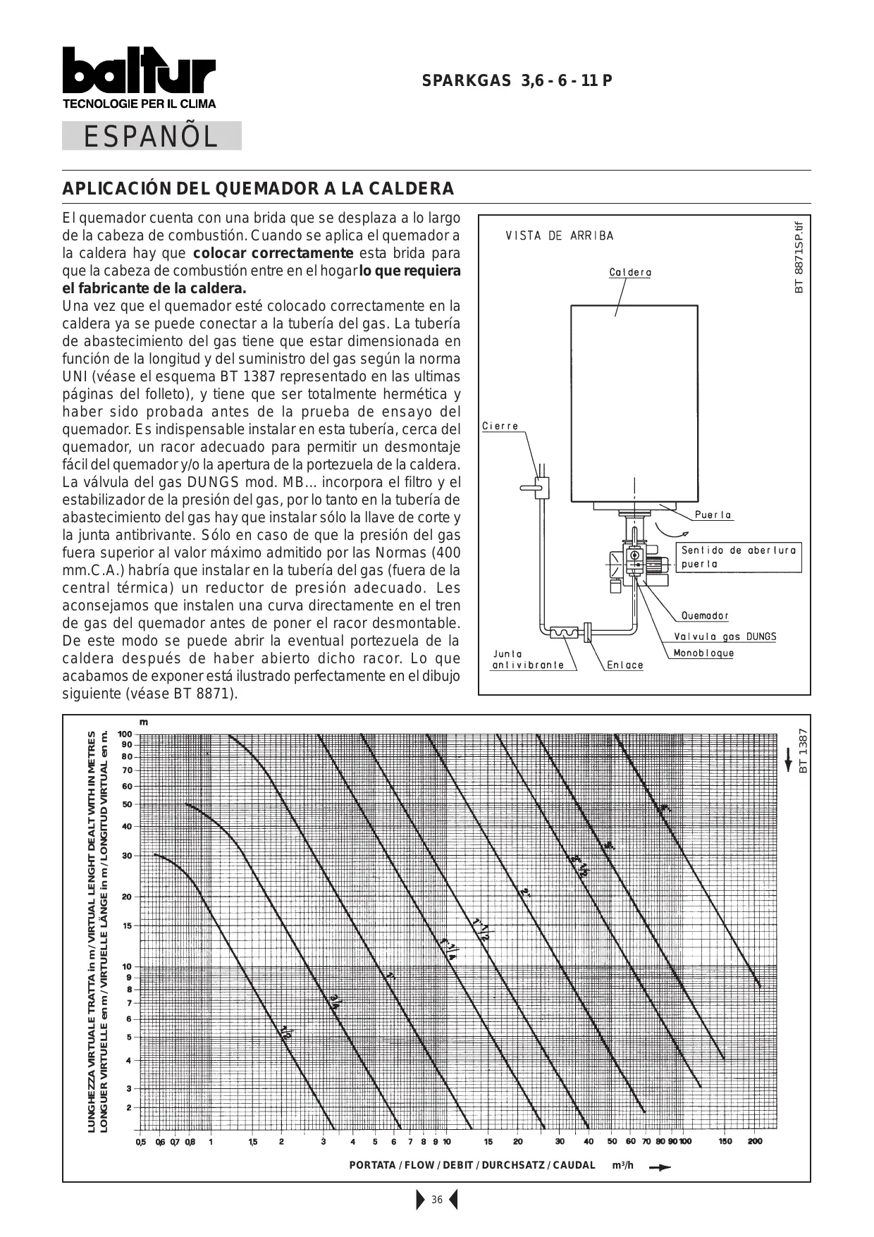 ESPANÕL APLICACIÓN DEL QUEMADOR A LA CALDERA LUNGHEZZA VIRTUALE TRATTA in m / VIRTUAL LENGHT DEALT WITH IN METRES LONGUER VIRTUELLE en m / VIRTUELLE LÄNGE in m / LONGITUD VIRTUAL en m. BT 1387 BT 8871SP.tif El quemador cuenta con una brida que se desplaza a lo largo de la cabeza de combustión. Cuando se aplica el quemador a la caldera hay que colocar correctamente esta brida para que la cabeza de combustión entre en el hogar lo que requiera el fabricante de la caldera. Una vez que el quemador esté colocado correctamente en la caldera ya se puede conectar a la tubería del gas. La tubería de abastecimiento del gas tiene que estar dimensionada en función de la longitud y del suministro del gas según la norma UNI (véase el esquema BT 1387 representado en las ultimas páginas del folleto), y tiene que ser totalmente hermética y haber sido probada antes de la prueba de ensayo del quemador. Es indispensable instalar en esta tubería, cerca del quemador, un racor adecuado para permitir un desmontaje fácil del quemador y/o la apertura de la portezuela de la caldera. La válvula del gas DUNGS mod. MB... incorpora el filtro y el estabilizador de la presión del gas, por lo tanto en la tubería de abastecimiento del gas hay que instalar sólo la llave de corte y la junta antibrivante. Sólo en caso de que la presión del gas fuera superior al valor máximo admitido por las Normas (400 mm.C.A.) habría que instalar en la tubería del gas (fuera de la central térmica) un reductor de presión adecuado. Les aconsejamos que instalen una curva directamente en el tren de gas del quemador antes de poner el racor desmontable. De este modo se puede abrir la eventual portezuela de la caldera después de haber abierto dicho racor. Lo que acabamos de exponer está ilustrado perfectamente en el dibujo siguiente (véase BT 8871).