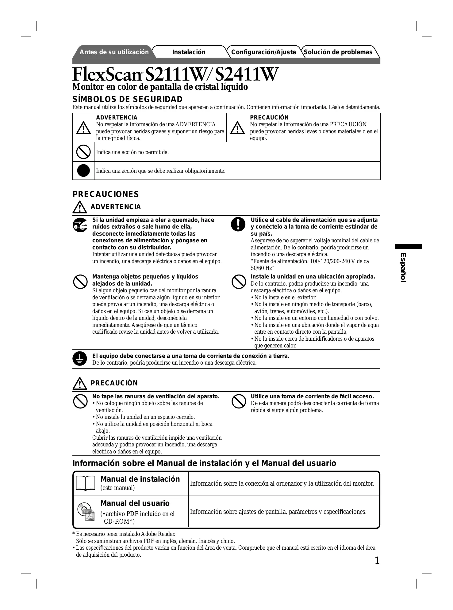 FlexScan S2111W/S2411W Monitor en color de pantalla de cristal liquido SiMBOLOS DE SEGURIDAD Este manual utiliza los simbolos de seguridad que aparecen a continuaciôn. Contienen informaciôn importante. Léalos detenidamente. ADVERTENCIA la integridad fisica. À No respetar la informaciôn de una A DV ERTENCIA À puede provocar heridas graves y suponer un riesgo para PRECAUCION No respetar la informacién de una PRECAUCIÔN puede provocar heridas leves o daños materiales o en el equipo. OS Indica una acciôn no permitida. © Indica una acciôn que se debe realizar obligatoriamente. PRECAUCIONES À ADVERTENCIA Si la unidad empieza a oler a quemado, hace ruidos extraños o sale humo de ella, desconecte inmediatamente todas las conexiones de alimentaciôn y péngase en contacto con su distribuidor. Intentar utilizar una unidad defectuosa puede provocar un incendio, una descarga eléctrica o daños en el equipo. Utilice el cable de alimentacién que se adjunta y conéctelo a la toma de corriente eständar de su pais. Asegürese de no superar el voltaje nominal del cable de alimentaciôn. De lo contrario, podria producirse un incendio o una descarga eléctrica. “Fuente de alimentacién: 100-120/200-240 V de ca 50/60 Hz” Mantenga objetos pequeños y liquidos alejados de la unidad. Si algün objeto pequeño cae del monitor por la ranura de ventilaciôn o se derrama algün liquido en su interior puede provocar un incendio, una descarga eléctrica o daños en el equipo. Si cae un objeto o se derrama un liquido dentro de la unidad, desconéctela inmediatamente. A segürese de que un técnico cualificado revise la unidad antes de volver a utilizarla. Instale la unidad en una ubicaciôn apropiada. De lo contrario, podria producirse un incendio, una descarga eléctrica o daños en el equipo.