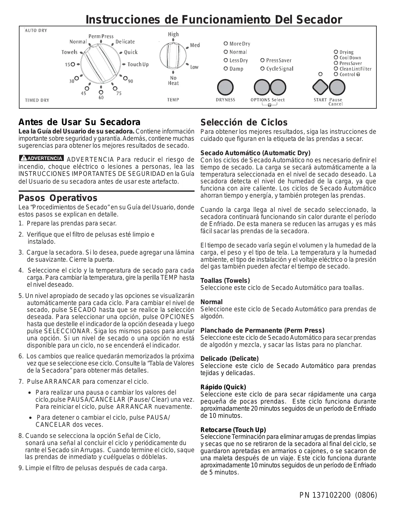 - Filtro de Pelusas Limpio (Clean Lint Filter) la Secadora” para obtener más detalles. Bloqueo de Control (Control Lock) Si se intenta realizar cambios después de que arranca el ciclo, la luz de estado parpadeará y la señal sonará 3 veces. Se debe hacer una pausa del ciclo antes de modificar los valores. Nivel de Secado Para cambiar el nivel de secado, pulse Sequedad (Dryness) hasta que se realice la selección deseada. Seleccione Normal para la mayoría de las cargas. Ocasionalmente, una carga puede parecer muy seca o mojada después de terminar el ciclo. Para aumentar el tiempo de secado para cargas similares en el futuro, seleccione Más Seco (More Dry). Para las cargas que requieren menos tiempo de secado, seleccione Menos Seco (Less Dry). PN 137102200 (0806)