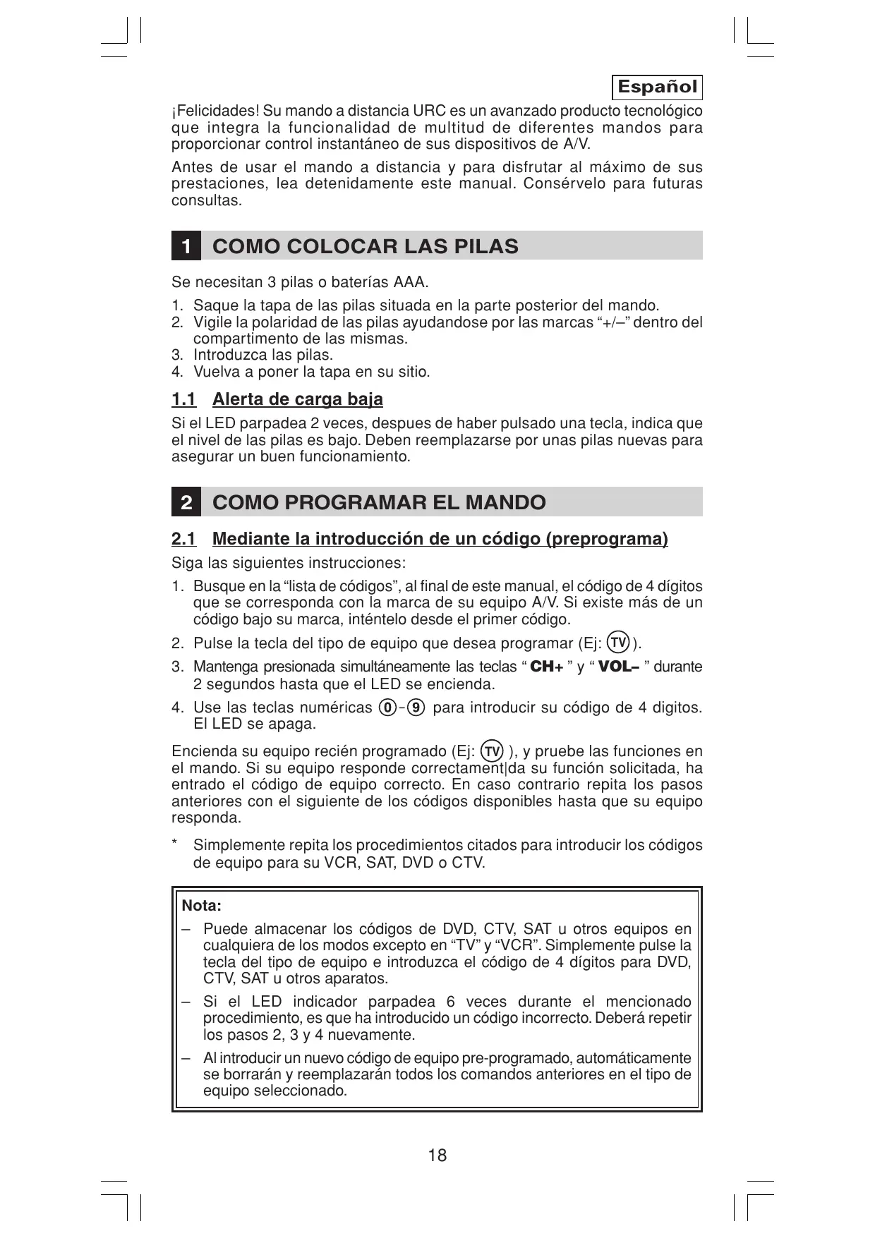 Control Remoto Universal (CRU) Instrucciones De Operacion Español ¡Felicidades! Su mando a distancia URC es un avanzado producto tecnológico que integra la funcionalidad de multitud de diferentes mandos para proporcionar control instantáneo de sus dispositivos de A/V. Antes de usar el mando a distancia y para disfrutar al máximo de sus prestaciones, lea detenidamente este manual. Consérvelo para futuras consultas.