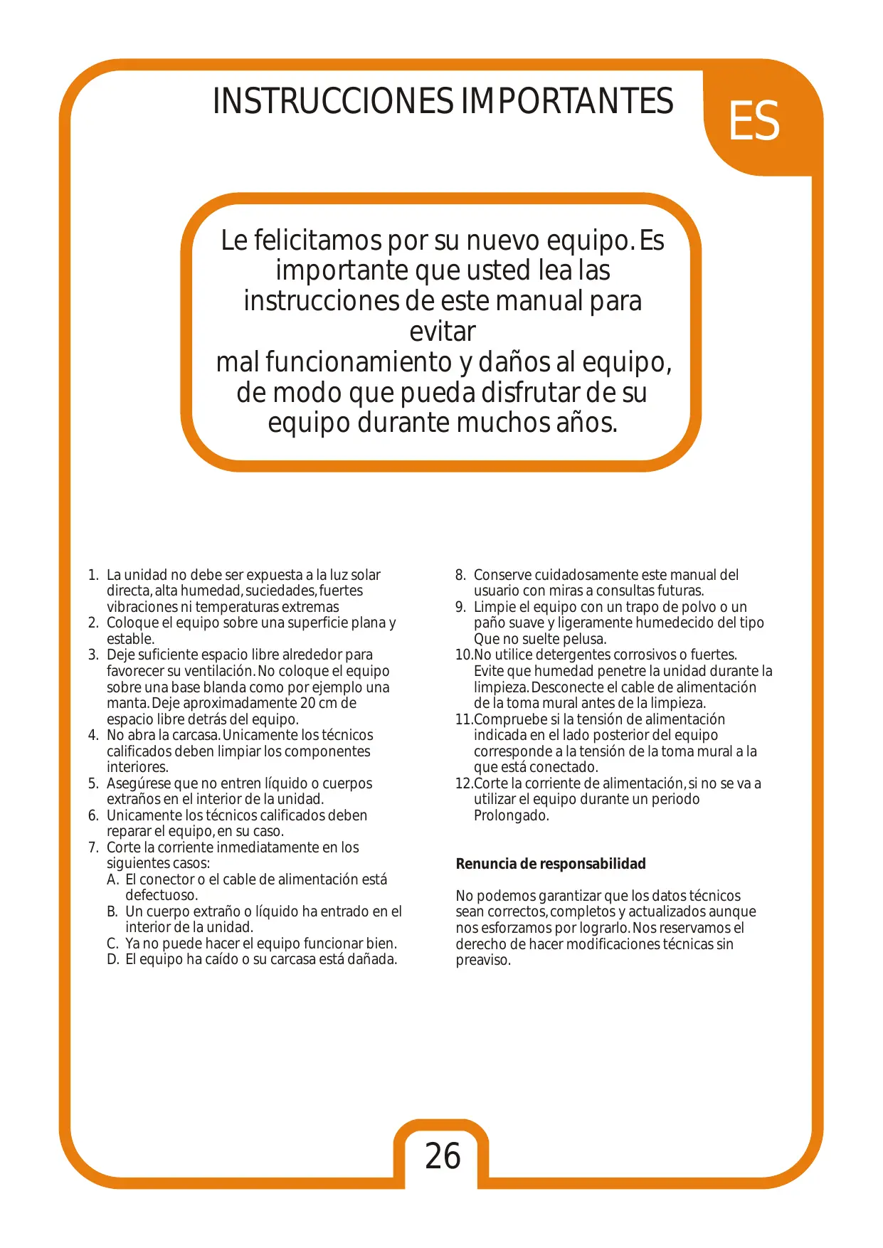 paño suave y ligeramente humedecido del tipo Que no suelte pelusa. 10.No utilice detergentes corrosivos o fuertes. Evite que humedad penetre la unidad durante la limpieza. Desconecte el cable de alimentación de la toma mural antes de la limpieza. 11.Compruebe si la tensión de alimentación indicada en el lado posterior del equipo corresponde a la tensión de la toma mural a la que está conectado. 12.Corte la corriente de alimentación, si no se va a utilizar el equipo durante un periodo Prolongado. Renuncia de responsabilidad No podemos garantizar que los datos técnicos sean correctos, completos y actualizados aunque nos esforzamos por lograrlo. Nos reservamos el derecho de hacer modificaciones técnicas sin preaviso.