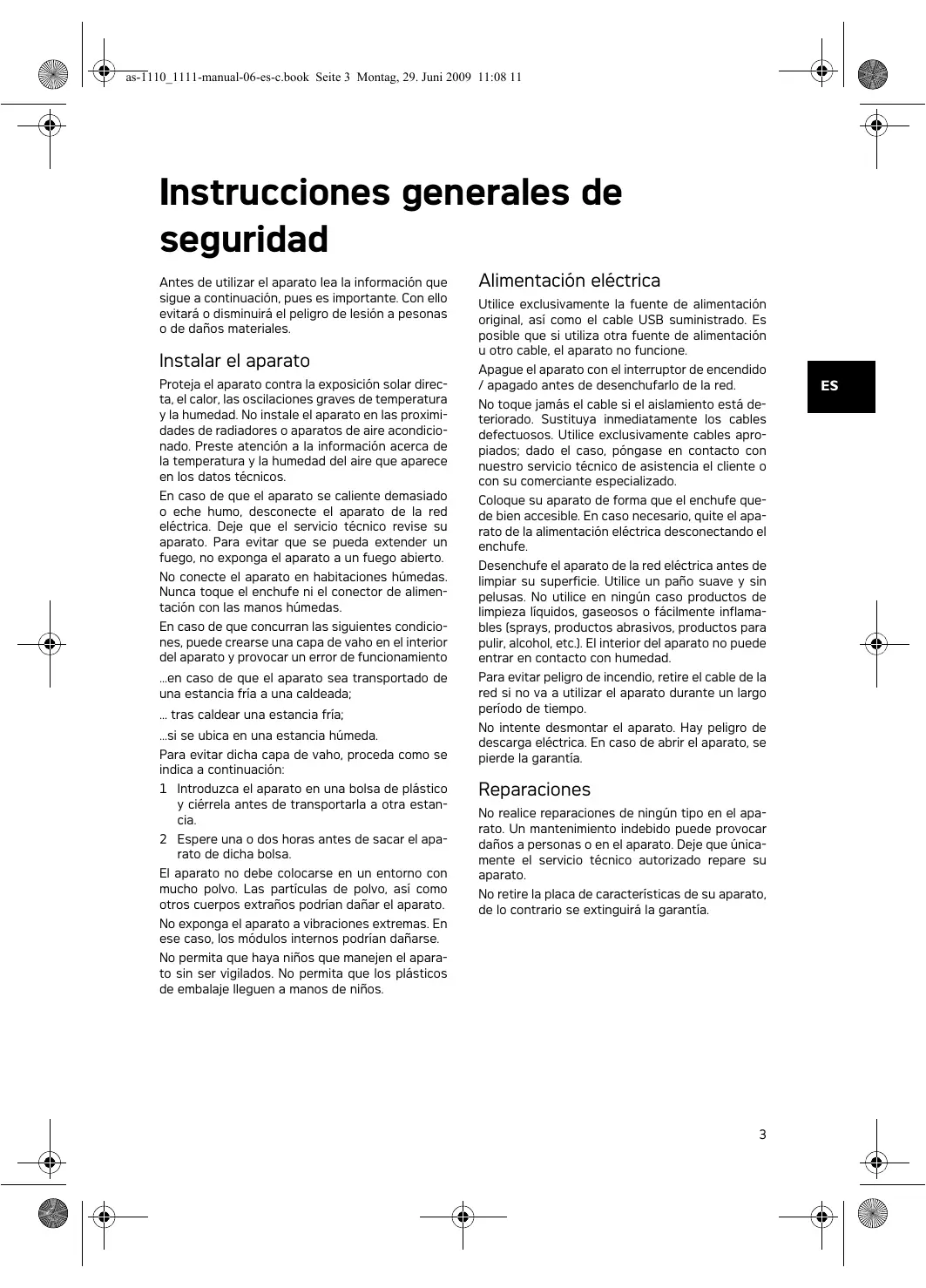 Instrucciones generales de seguridad Instrucciones generales de seguridad Antes de utilizar el aparato lea la información que sigue a continuación, pues es importante. Con ello evitará o disminuirá el peligro de lesión a pesonas o de daños materiales. Instalar el aparato Proteja el aparato contra la exposición solar directa Proteja el aparato contra la exposición solar directa, el calor, las oscilaciones graves de temperatura y la humedad. No instale el aparato en las proximidades de radiadores o aparatos de aire acondicionado. Preste atención a la información acerca de la temperatura y la humedad del aire que aparece en los datos técnicos. En caso de que el aparato se caliente demasiado o eche humo En caso de que el aparato se caliente demasiado o eche humo, desconecte el aparato de la red eléctrica. Deje que el servicio técnico revise su aparato. Para evitar que se pueda extender un fuego, no exponga el aparato a un fuego abierto. No conecte el aparato en habitaciones húmedas. No conecte el aparato en habitaciones húmedas. Nunca toque el enchufe ni el conector de alimentación con las manos húmedas. Capa de vaho En caso de que concurran las siguientes condiciones, puede crearse una capa de vaho en el interior del aparato y provocar un error de funcionamiento Alimentación eléctrica Utilice exclusivamente la fuente de alimentación original, así como el cable USB suministrado. Utilice exclusivamente la fuente de alimentación original, así como el cable USB suministrado. Es posible que si utiliza otra fuente de alimentación u otro cable, el aparato no funcione. Interruptor general de encendido y apagado Apague el aparato con el interruptor de encendido / apagado antes de desenchufarlo de la red. No toque jamás el cable si el aislamiento está deteriorado. No toque jamás el cable si el aislamiento está deteriorado. Sustituya inmediatamente los cables defectuosos. Utilice exclusivamente cables apropiados; dado el caso, póngase en contacto con nuestro servicio técnico de asistencia el cliente o con su comerciante especializado. Coloque su aparato de forma que el enchufe quede bien accesible. Coloque su aparato de forma que el enchufe quede bien accesible. En caso necesario, quite el aparato de la alimentación eléctrica desconectando el enchufe. Desenchufe el aparato de la red eléctrica antes de limpiar su superficie. Desenchufe el aparato de la red eléctrica antes de limpiar su superficie. Utilice un paño suave y sin pelusas. No utilice en ningún caso productos de limpieza líquidos, gaseosos o fácilmente inflamables (sprays, productos abrasivos, productos para pulir, alcohol, etc.). El interior del aparato no puede entrar en contacto con humedad. Para evitar peligro de incendio, retire el cable de la red si no va a utilizar el aparato durante un largo período de tiempo. ...en caso de que el aparato sea transportado de una estancia fría a una caldeada; ... tras caldear una estancia fría; ...si se ubica en una estancia húmeda. Para evitar dicha capa de vaho, proceda como se indica a continuación: 1 Introduzca el aparato en una bolsa de plástico y ciérrela antes de transportarla a otra estancia. 2 Espere una o dos horas antes de sacar el aparato de dicha bolsa. El aparato no debe colocarse en un entorno con mucho polvo. El aparato no debe colocarse en un entorno con mucho polvo. Las partículas de polvo, así como otros cuerpos extraños podrían dañar el aparato. No exponga el aparato a vibraciones extremas. Para evitar peligro de incendio, retire el cable de la red si no va a utilizar el aparato durante un largo período de tiempo. No intente desmontar el aparato. Hay peligro de descarga eléctrica. En caso de abrir el aparato, se pierde la garantía. Reparaciones Reparaciones No realice reparaciones de ningún tipo en el aparato. Un mantenimiento indebido puede provocar daños a personas o en el aparato. Deje que únicamente el servicio técnico autorizado repare su aparato. No retire la placa de características de su aparato, de lo contrario se extinguirá la garantía. No exponga el aparato a vibraciones extremas. En ese caso, los módulos internos podrían dañarse. No permita que haya niños que manejen el aparato sin ser vigilados. No permita que haya niños que manejen el aparato sin ser vigilados. No permita que los plásticos de embalaje lleguen a manos de niños.