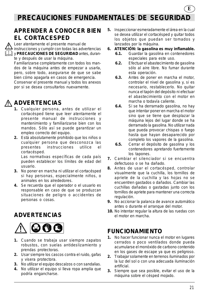 - SINAIS DE SEGURANÇA - ÓÇÌÁÔÁ ÁÓÖÁËÅÉÁÓ - BEZPEÈNOSTNÍ SIGNALIZACE I GB F D NL E P GR CS PRECAUCIONES FUNDAMENTALES DE SEGURIDAD APRENDER A CONOCER BIEN EL CORTACESPED Leer atentamente el presente manual de instrucciones y cumplir con todas las advertencias y PRECAUCIONES DE SEGURIDAD antes, durante y después de usar la máquina.