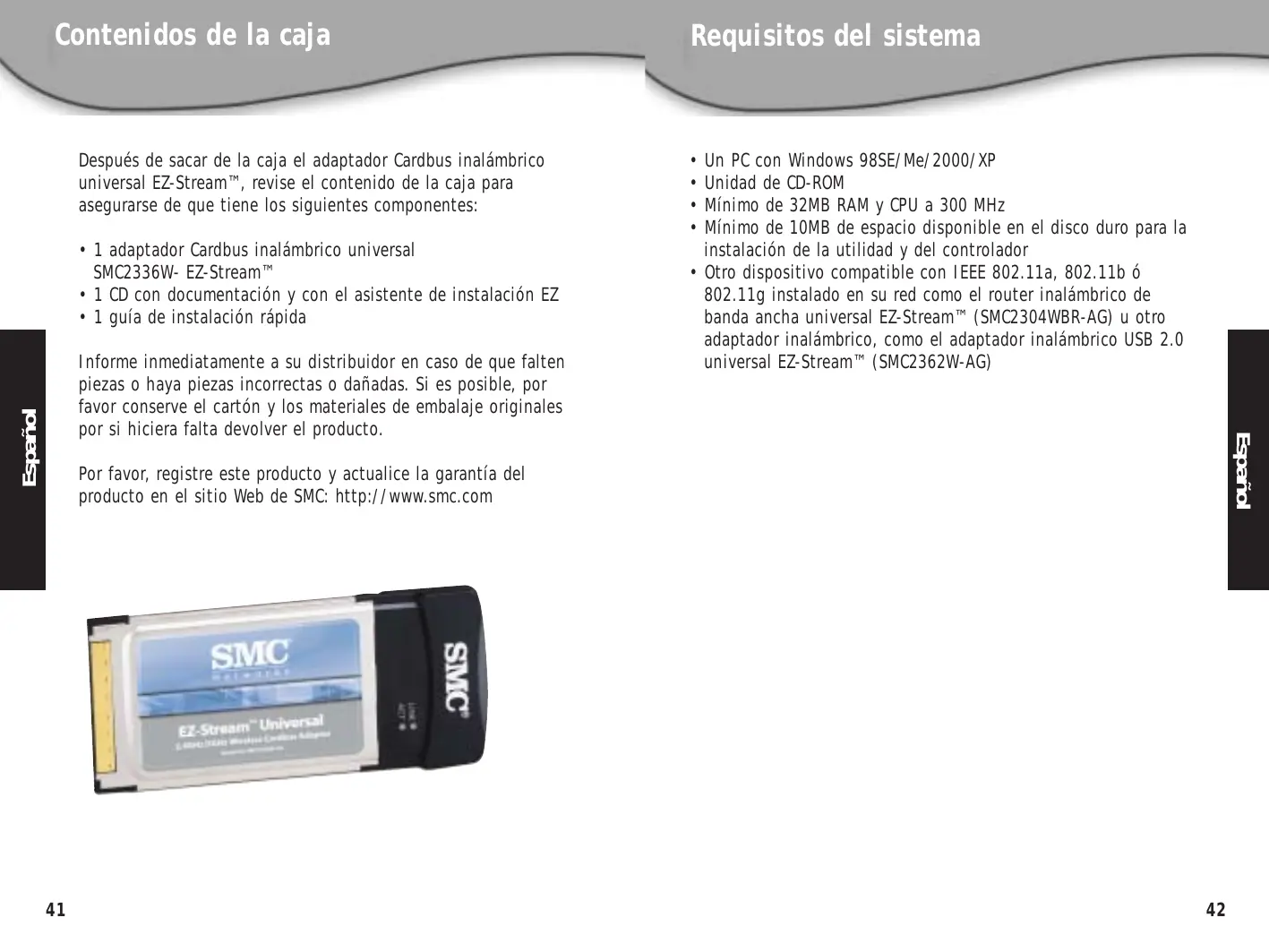 - 1 CD con documentaciôn y con el asistente de instalaciôn EZ + 1 guia de instalaciôn râpida Informe inmediatamente a su distribuidor en caso de que falten piezas o haya piezas incorrectas o dañadas. Si es posible, por favor conserve el cartén y los materiales de embalaje originales por si hiciera falta devolver el producto. Por favor, registre este producto y actualice la garantia del producto en el sitio Web de SMC: http://www.smc.com