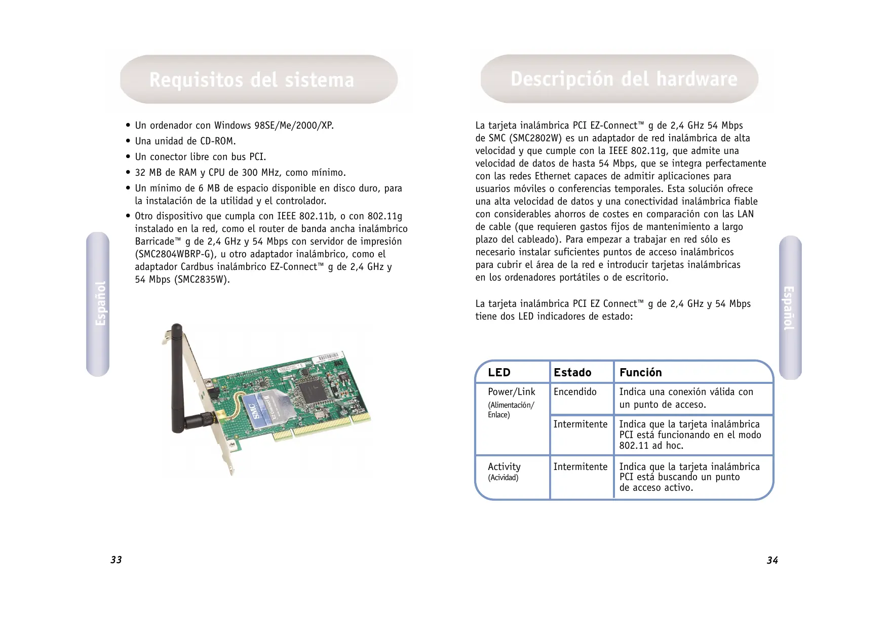 - Otro dispositivo que cumpla con IEEE 802.11b, o con 802.11g instalado en la red, como el router de banda ancha inalámbrico Barricade™ g de 2,4 GHz y 54 Mbps con servidor de impresión (SMC2804WBRP-G), u otro adaptador inalámbrico, como el adaptador Cardbus inalámbrico EZ-Connect™ g de 2,4 GHz y 54 Mbps (SMC2835W). La tarjeta inalámbrica PCI EZ-Connect™ g de 2,4 GHz 54 Mbps de SMC (SMC2802W) es un adaptador de red inalámbrica de alta velocidad y que cumple con la IEEE 802.11g, que admite una velocidad de datos de hasta 54 Mbps, que se integra perfectamente con las redes Ethernet capaces de admitir aplicaciones para usuarios móviles o conferencias temporales. Esta solución ofrece una alta velocidad de datos y una conectividad inalámbrica fiable con considerables ahorros de costes en comparación con las LAN de cable (que requieren gastos fijos de mantenimiento a largo plazo del cableado). Para empezar a trabajar en red sólo es necesario instalar suficientes puntos de acceso inalámbricos para cubrir el área de la red e introducir tarjetas inalámbricas en los ordenadores portátiles o de escritorio. Español Español