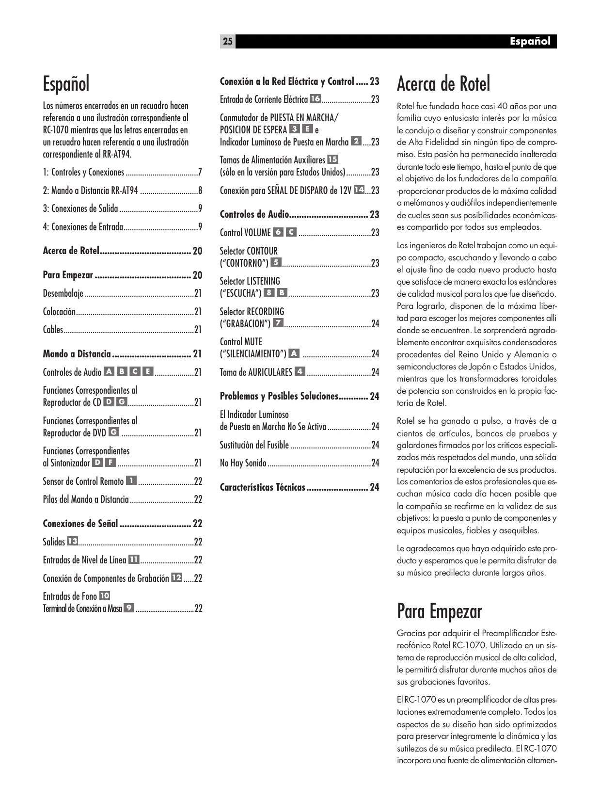 Le rogamos que lea cuidadosamente el presente manual de instrucciones. Además de las instructaciones BASicas de instalación y esta a punto del RC-1070, incluye información de gran valor sobre lasdietres configuraciones que permite el aparato, asi como informacion general que le ayudara a optimizar las prestaciones de su sistemas. Le rogamos assimismo que contacte con su distribuidor autorizzato de productos Rotel paraequalquier duda o consulta.No le quepa la menor duda de que todos sus commentarios y observaciones seran bien recibidos.