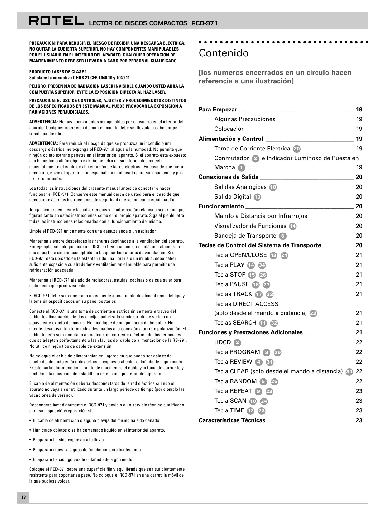 Satisface la normativa DHHS 21 CFR 1040.10 y 1040.11 PELIGRO: PRESENCIA DE RADIACION LASER INVISIBLE CUANDO USTED ABRA LA COMPUERTA SUPERIOR. EVITE LA EXPOSICION DIRECTA AL HAZ LASER. PRECAUCION: EL USO DE CONTROLE, AJUSTES Y PROCEDIMIENSTOS DISTINTOS DE LOS ESPECIFICADOS EN ESTE MANUAL PUEDE PROVOCAR LA EXPOSICION A RADIACIONES PERJUDICIALES. ADVERTENCIA: No hay componentes manipulables por el usuario en el interior del aparato. Cualquier operacién de mantenimiento debe ser Ilevada a cabo por per- sonal cualificado. ADVERTENCIA: Para reducir el riesgo de que se produzca un incendio o una descarga eléctrica, no expanga el RCD-971 al agua o la humedad. No permita que ningôn objeto extraño penetre en el interior del aparato. Si el aparato esté expuesto a la humedad o algün objeto extraño penetra en su interior, desconecte inmediatamente el cable de alimentaciôn de la red eléctrica. En caso de que fuera necesario, envie el aparato a un especialista cualificado para su inspecciôn y pos- terior reparaciôn. Lea todas las instrucciones del presente manual antes de conectar 0 hacer funcionar el RCD-971. Conserve este manual cerca de usted para el caso de que necesite revisar las instrucciones de seguridad que se indican a continuaciéôn. Tenga siempre en mente las advertencias y la informacién relativa a seguridad que figuran tanto en estas instrucciones como en el propio aparato. Siga al pie de letra todas las instrucciones relacionadas con el funcionamiento del mismo. Limpie el RCD-971 dnicamente con una gamuza seca o un aspirador. Mantenga siempre despejadas las ranuras destinadas a la ventilaciôn del aparato. Por ejemplo, no coloque nunca el RCD-971 en una cama, un sofé, una alfombra 0 una superficie similar susceptible de bloquear las ranuras de ventilaciôn. Si el RCD-971 esté ubicado en la estanteria de una libreria o un mueble, debe haber suficiente espacio a su alrededor y ventilaciôn en el mueble para permitir una refrigeraciôn adecuada. Mantenga al RCD-971 alejado de radiadores, estufas, cocinas o de cualquier otra instalaciôn que produzca calor. El RCD-971 debe ser conectado ünicamente a una fuente de alimentaciôn del tipo y la tensién especificados en su panel posterior. Conecte el RCD-971 a una toma de corriente eléctrica ünicamente a través del cable de alimentacién de dos clavijas polarizado suministrado de serie o un équivalente exacto del mismo. No modifique de ningün modo dicho cable. No intente desactivar los terminales destinados a la conexiôn a tierra o polarizacién. El cable deberia ser conectado a una toma de corriente eléctrica de dos terminales que se adapten perfectamente a las clavijas del cable de alimentacién de la RB-991 No utlice ningûn tipo de cable de extensiôn. No coloque el cable de alimentaciôn en lugares en que pueda ser aplastado, pinchado, doblado en éngulos criicos, expuesto al calor o dañado de algün modo. Preste particular atenciôn al punto de uniôn entre el cable y la toma de corriente y también a la ubicaciôn de esta ültima en el panel posterior del aparato. El cable de alimentaciôn deberia desconectarse de la red eléctrica cuando el aparato no vaya a ser utilizado durante un largo periodo de tiempo (por ejemplo las vacaciones de verano). Desconecte inmediatamente el RCD-971 y envielo a un servicio técnico cualificado para su inspecciôn/reparaciôn si + El cable de alimentaciôn 0 alguna clavija del mismo ha sido dañado + Han caido objetos o se ha derramado liquido en el nterior del aparato. + El aparato ha sido expuesto a la uv. + El aparato muestra signos de funcionamiento inadecuado. + El aparato ha sido golpeado o dañado de algün modo. Coloque el RCD-971 sobre una superficie fija y equilibrada que sea suficientemente resistente para soportar su peso. No coloque el RCD-971 en una carretilla môvil de la que pudiese volcar. RCD-971 Contenido [los nümeros encerrados en un circulo hacen referencia a una ilustracién] Para Empezar 19 Algunas Precauciones 19 Colocaciôn 19 Alimentaciôn y Control 19 Toma de Corriente Eléctrica @) 19 Conmutador €} e Indicador Luminoso de Puesta en Marcha @ 19 Conexiones de Salida 20 Salidas Analégicas Œ) 20 Salida Digital Œ) 20 Funcionamiento 20 Mando a Distancia por Infrarrojos 20 Visualizador de Funciones Œ) 20 Bandeja de Transporte €) 20 Teclas de Control del Sistema de Transporte 20 Tecla OPEN/CLOSE © 4) 21 Tecla PLAY © @ 21 Tecla STOP © © 21 Tecla PAUSE Œ) 4) 21 Teclas TRACK Œ) © 21 Teclas DIRECT ACCESS {solo desde el mando a distancia) 21 Teclas SEARCH Œ) © 21 Funciones y Prestaciones Adicionales 21 HDCD © 22 Tecla PROGRAM © © 22 Tecla REVIEW @ €) 22 Tecla CLEAR (solo desde el mando a distancia) @) 22 Tecla RANDOM @ © 22 Tecla REPEAT © © 23 Tecla SCAN © © 23 Tecla TIME © © 23 Caracteristicas Técnicas 23
