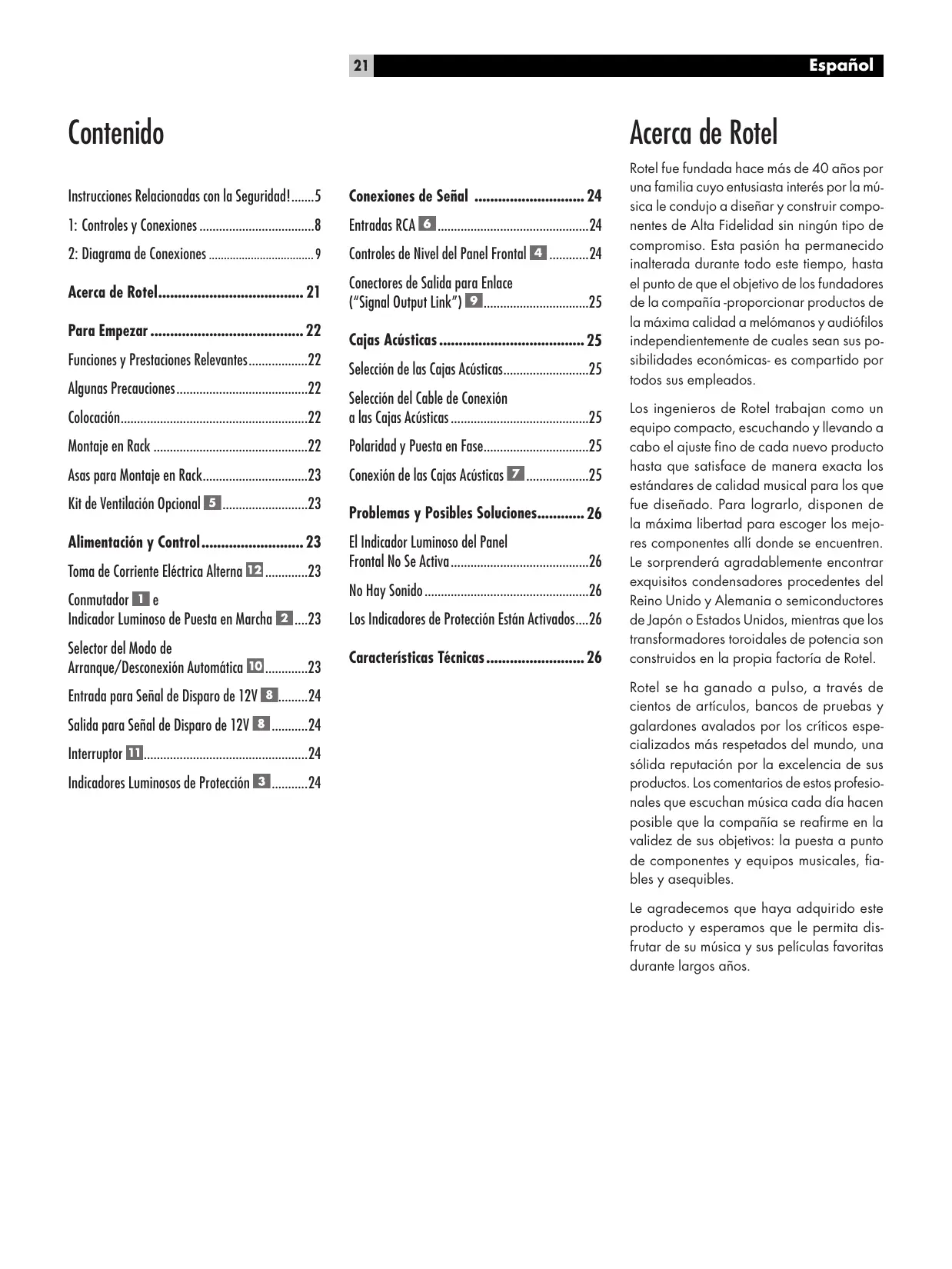 Rotel fue fundada hace más de 40 años por una familia cuyo entusiasta interés por la música le condujo a diseñar y construir componentes de Alta Fidelidad sin ningún tipo de compromiso. Esta pasión ha permanecido inalterada durante todo este tiempo, hasta el punto de que el objetivo de los fundadores de la compañía -proporcionar productos de la máxima calidad a melómanos y audiófilos independientemente de cuales sean sus posibilidades económicas- es compartido por todos sus empleados. Los ingenieros de Rotel trabajan como un equipo compacto, escuchando y llevando a cabo el ajuste fino de cada nuevo producto hasta que satisface de manera exacta los estándares de calidad musical para los que fue diseñado. Para lograrlo, disponen de la máxima libertad para escoger los mejores componentes allí donde se encuentren. Le sorprenderá agradablemente encontrar exquisitos condensadores procedentes del Reino Unido y Alemania o semiconductores de Japón o Estados Unidos, mientras que los transformadores toroidales de potencia son construidos en la propia factoría de Rotel. Rotel se ha ganado a pulso, a través de cientos de artículos, bancos de pruebas y galardones avalados por los críticos especializados más respetados del mundo, una sólida reputación por la excelencia de sus productos. Los comentarios de estos profesionales que escuchan música cada día hacen posible que la compañía se reafirme en la validez de sus objetivos: la puesta a punto de componentes y equipos musicales, fiables y asequibles. Le agradecemos que haya adquirido este producto y esperamos que le permita disfrutar de su música y sus películas favoritas durante largos años.