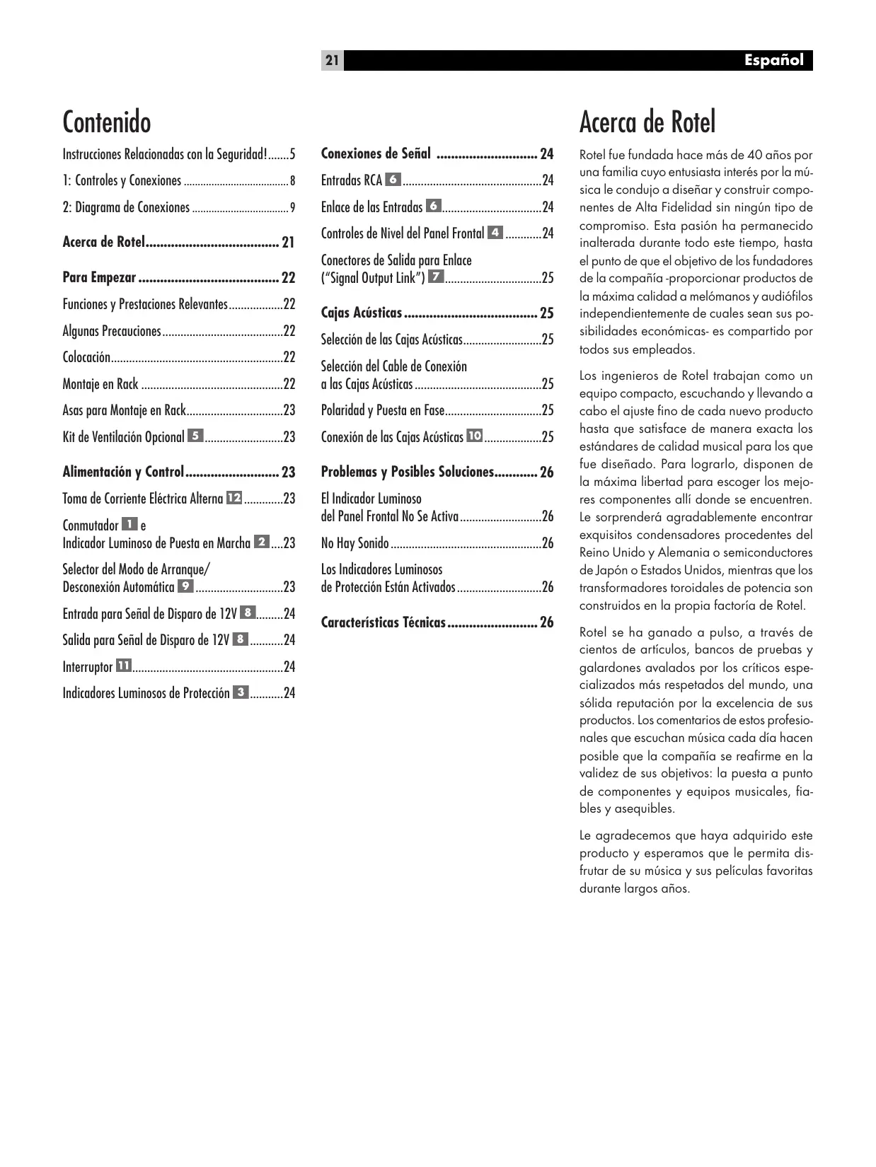 Rotel fue fundada hace más de 40 años por una familia cuyo entusiasta interés por la música le condujo a diseñar y construir componentes de Alta Fidelidad sin ningún tipo de compromiso. Esta pasión ha permanecido inalterada durante todo este tiempo, hasta el punto de que el objetivo de los fundadores de la compañía -proporcionar productos de la máxima calidad a melómanos y audiófilos independientemente de cuales sean sus posibilidades económicas- es compartido por todos sus empleados. Los ingenieros de Rotel trabajan como un equipo compacto, escuchando y llevando a cabo el ajuste fino de cada nuevo producto hasta que satisface de manera exacta los estándares de calidad musical para los que fue diseñado. Para lograrlo, disponen de la máxima libertad para escoger los mejores componentes allí donde se encuentren. Le sorprenderá agradablemente encontrar exquisitos condensadores procedentes del Reino Unido y Alemania o semiconductores de Japón o Estados Unidos, mientras que los transformadores toroidales de potencia son construidos en la propia factoría de Rotel. Rotel se ha ganado a pulso, a través de cientos de artículos, bancos de pruebas y galardones avalados por los críticos especializados más respetados del mundo, una sólida reputación por la excelencia de sus productos. Los comentarios de estos profesionales que escuchan música cada día hacen posible que la compañía se reafirme en la validez de sus objetivos: la puesta a punto de componentes y equipos musicales, fiables y asequibles. Le agradecemos que haya adquirido este producto y esperamos que le permita disfrutar de su música y sus películas favoritas durante largos años.