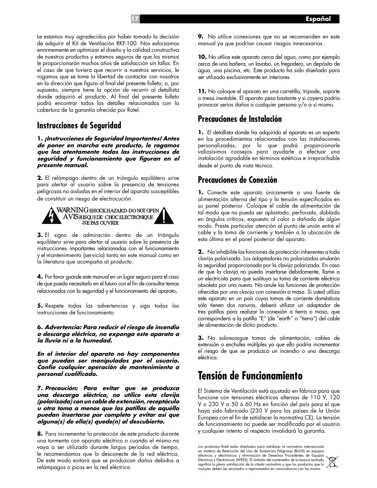 Le estamos muy agradecidos por haber tomado la decisión de adquirir el Kit de Ventilación RKF-100. Nos esforzamos enormemente en optimizar el diseño y la calidad constructiva de nuestros productos y estamos seguros de que los mismos le proporcionarán muchos años de satisfacción sin fallos. En el caso de que tuviera que recurrir a nuestros servicios, le rogamos que se tome la libertad de contactar con nosotros en la dirección que figura al final del presente folleto; o, por supuesto, siempre tiene la opción de recurrir al detallista donde adquirió el producto. Al final del presente folleto podrá encontrar todos los detalles relacionados con la cobertura de la garantía ofrecida por Rotel. Instrucciones de Seguridad