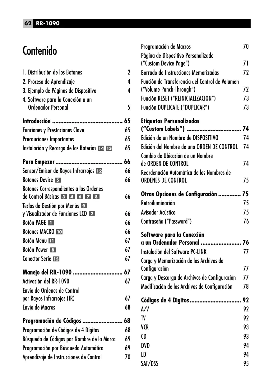Conector Serie Manejo del RR-1090 ............................... 67 Activación del RR-1090 Envío de Ordenes de Control por Rayos Infrarrojos (IR) Envío de Macros Programación de Códigos ......................... 68 Programación de Códigos de 4 Dígitos Búsqueda de Códigos por Nombre de la Marca 69 Programación por Búsqueda Automática Aprendizaje de Instrucciones de Control