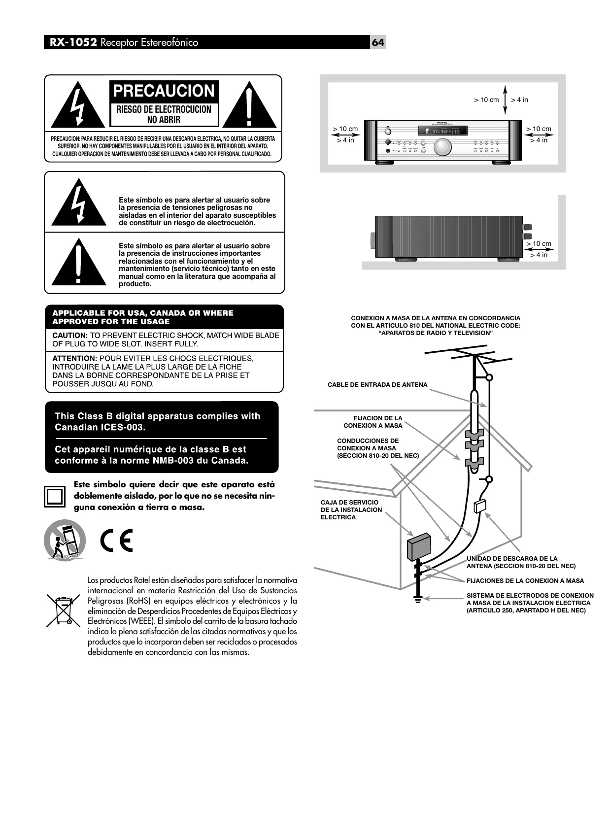 ANTENA (SECCION 810-20 DEL NEC) Los productos Rotel están diseñados para satisfacer la normativa internacional en materia Restricción del Uso de Sustancias Peligrosas (RoHS) en equipos eléctricos y electrónicos y la eliminación de Desperdicios Procedentes de Equipos Eléctricos y Electrónicos (WEEE). El símbolo del carrito de la basura tachado indica la plena satisfacción de las citadas normativas y que los productos que lo incorporan deben ser reciclados o procesados debidamente en concordancia con las mismas.