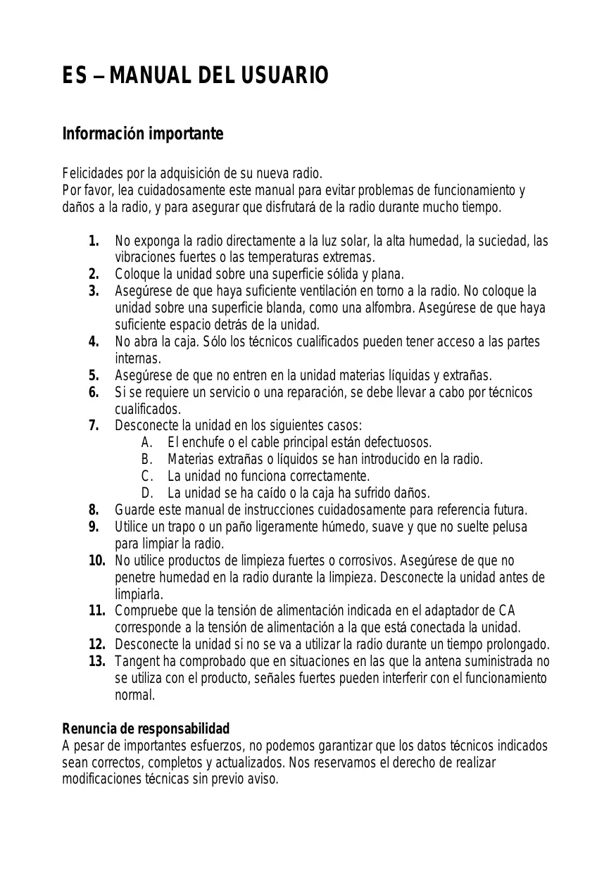 Información importante Felicidades por la adquisición de su nueva radio. Por favor, lea cuidadosamente este manual para evitar problemas de funcionamiento y daños a la radio, y para asegurar que disfrutará de la radio durante mucho tiempo.