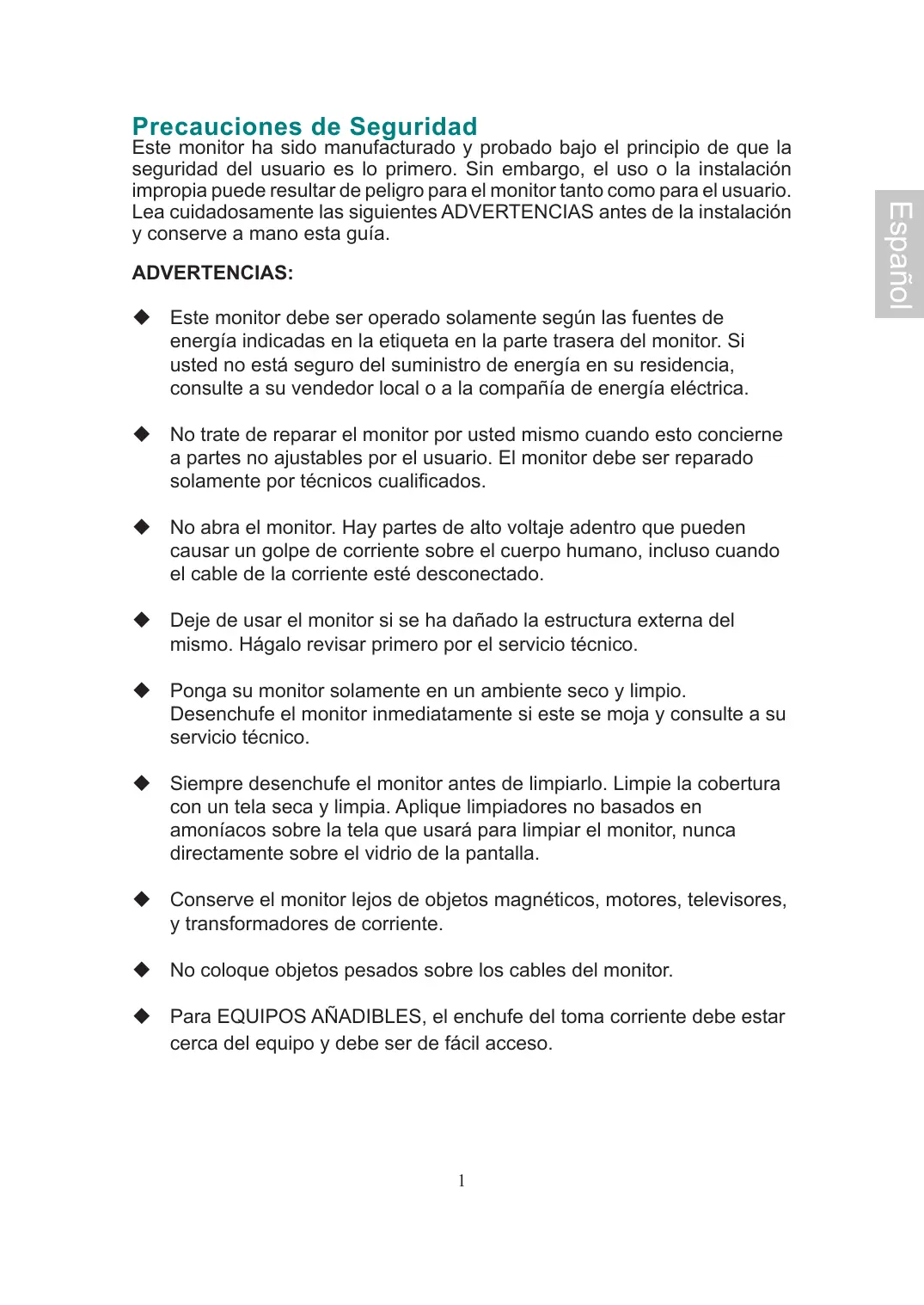 No abra el monitor. Hay partes de alto voltaje adentro que pueda causar un golpe de corriente sobre el cuerpo humano, incluo cuando el cable de la corriente está desconnectado.