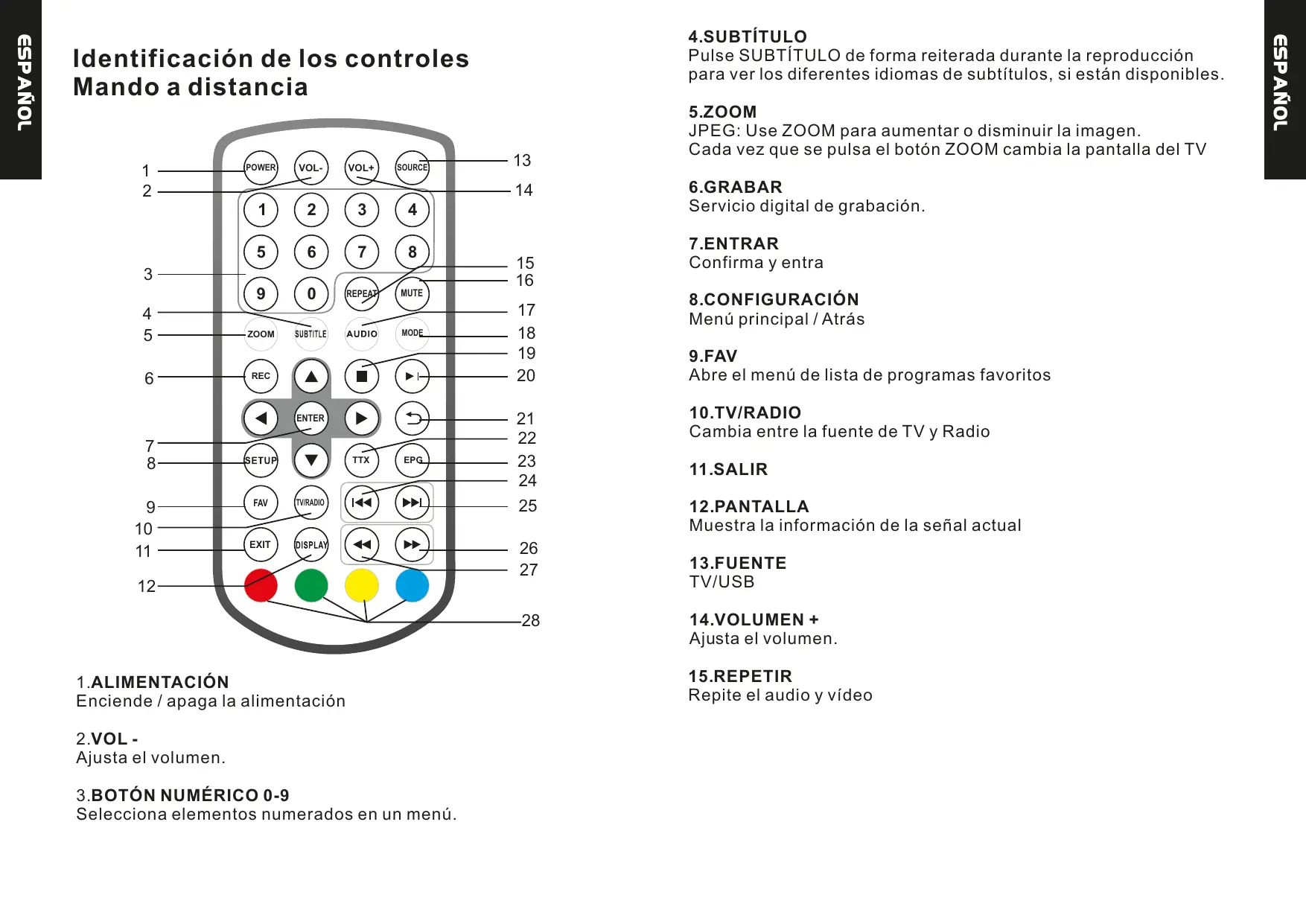 15.REPETIR Repite el audio y vídeo 1.ALIMENTACIÓN Enciende / apaga la alimentación 2.VOL Ajusta el volumen.