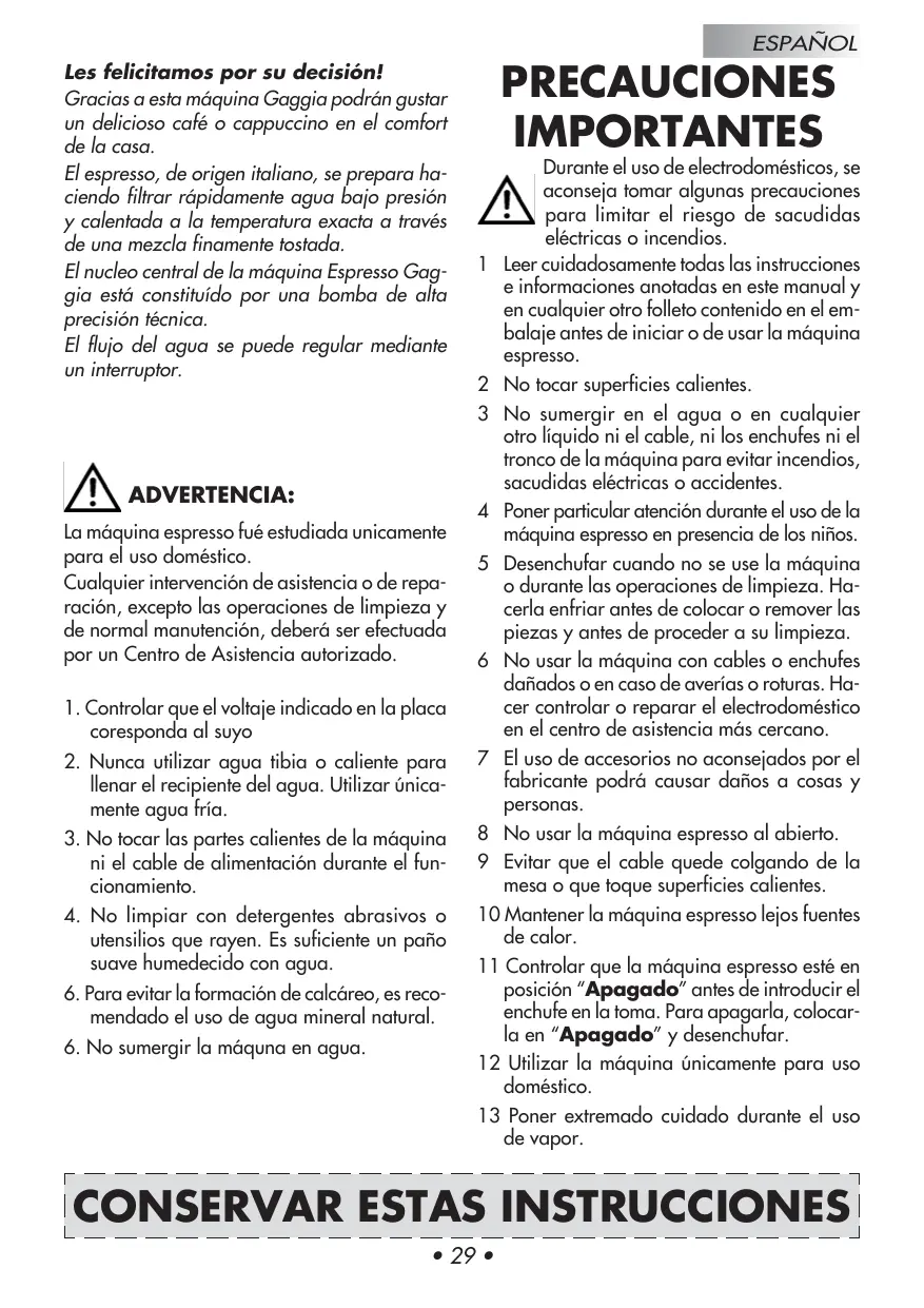 1 Leer cuidadosamente todas las instrucciones e informaciones anotadas en este manual y en cualquier otro folleto contenido en el embalaje antes de iniciar o de usar la máquina espresso. 2 No tocar superficies calientes. 3 No sumergir en el agua o en cualquier otro líquido ni el cable, ni los enchufes ni el tronco de la máquina para evitar incendios, sacudidas eléctricas o accidentes. 4 Poner particular atención durante el uso de la máquina espresso en presencia de los niños. 5 Desenchufar cuando no se use la máquina o durante las operaciones de limpieza. Hacerla enfriar antes de colocar o remover las piezas y antes de proceder a su limpieza. 6 No usar la máquina con cables o enchufes dañados o en caso de averías o roturas. Hacer controlar o reparar el electrodoméstico en el centro de asistencia más cercano. 7 El uso de accesorios no aconsejados por el fabricante podrá causar daños a cosas y personas. 8 No usar la máquina espresso al abierto. 9 Evitar que el cable quede colgando de la mesa o que toque superficies calientes. 10 Mantener la máquina espresso lejos fuentes de calor. 11 Controlar que la máquina espresso esté en posición “Apagado” antes de introducir el enchufe en la toma. Para apagarla, colocarla en “Apagado” y desenchufar. 12 Utilizar la máquina únicamente para uso doméstico. 13 Poner extremado cuidado durante el uso de vapor.