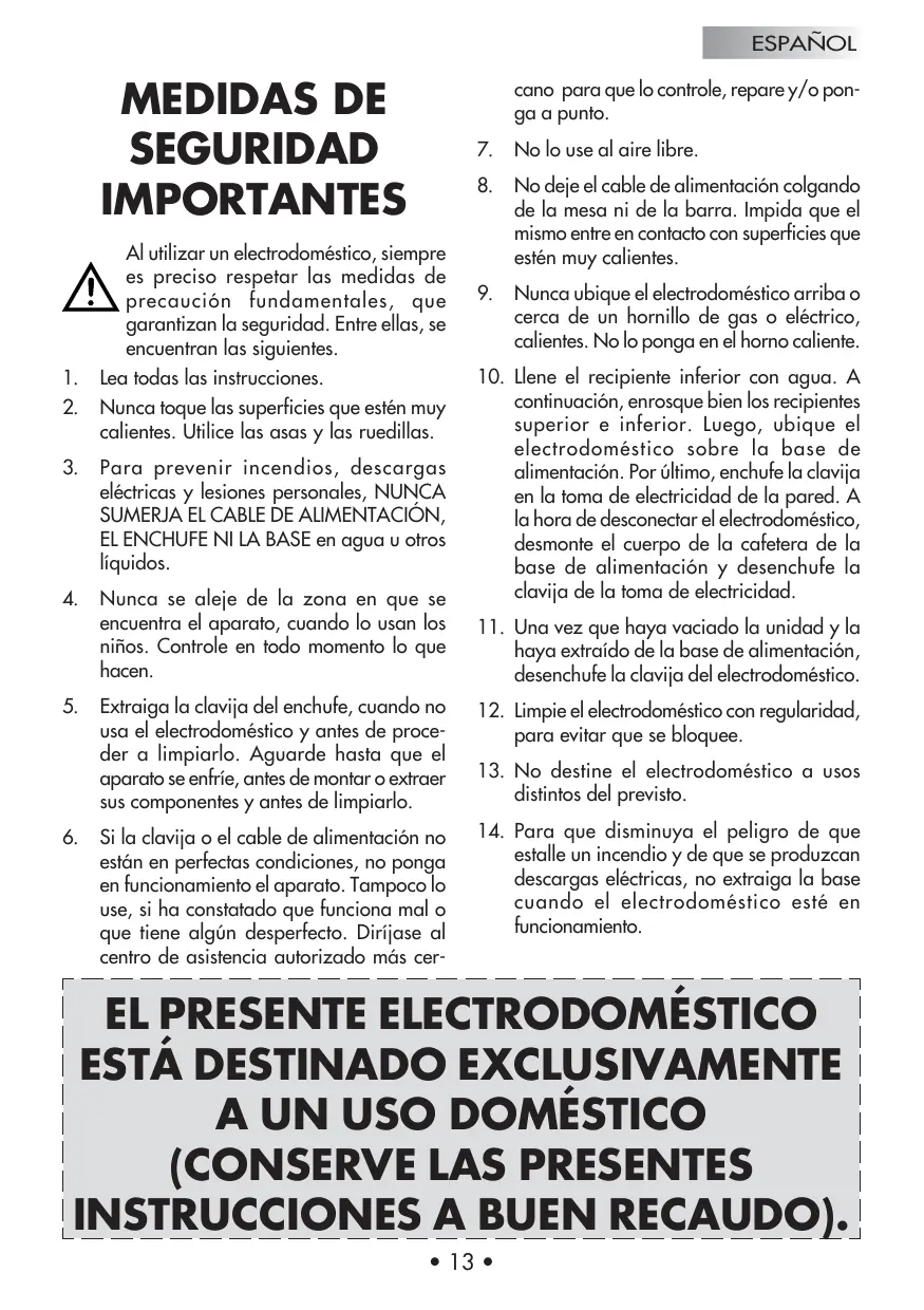 Desenchufe la clavija, eche el café en las tazas y sirva. IMPORTANTE: cuando el agua hierve, la tapa tiene que permanecer cerrada. ¡CUIDADO!: el cuerpo de acero inoxidable puede estar a temperaturas muy elevadas. No toque las superficies que estén muy calientes, hasta que se enfríen. AVISO : nunca encienda electrodoméstico sin agua.