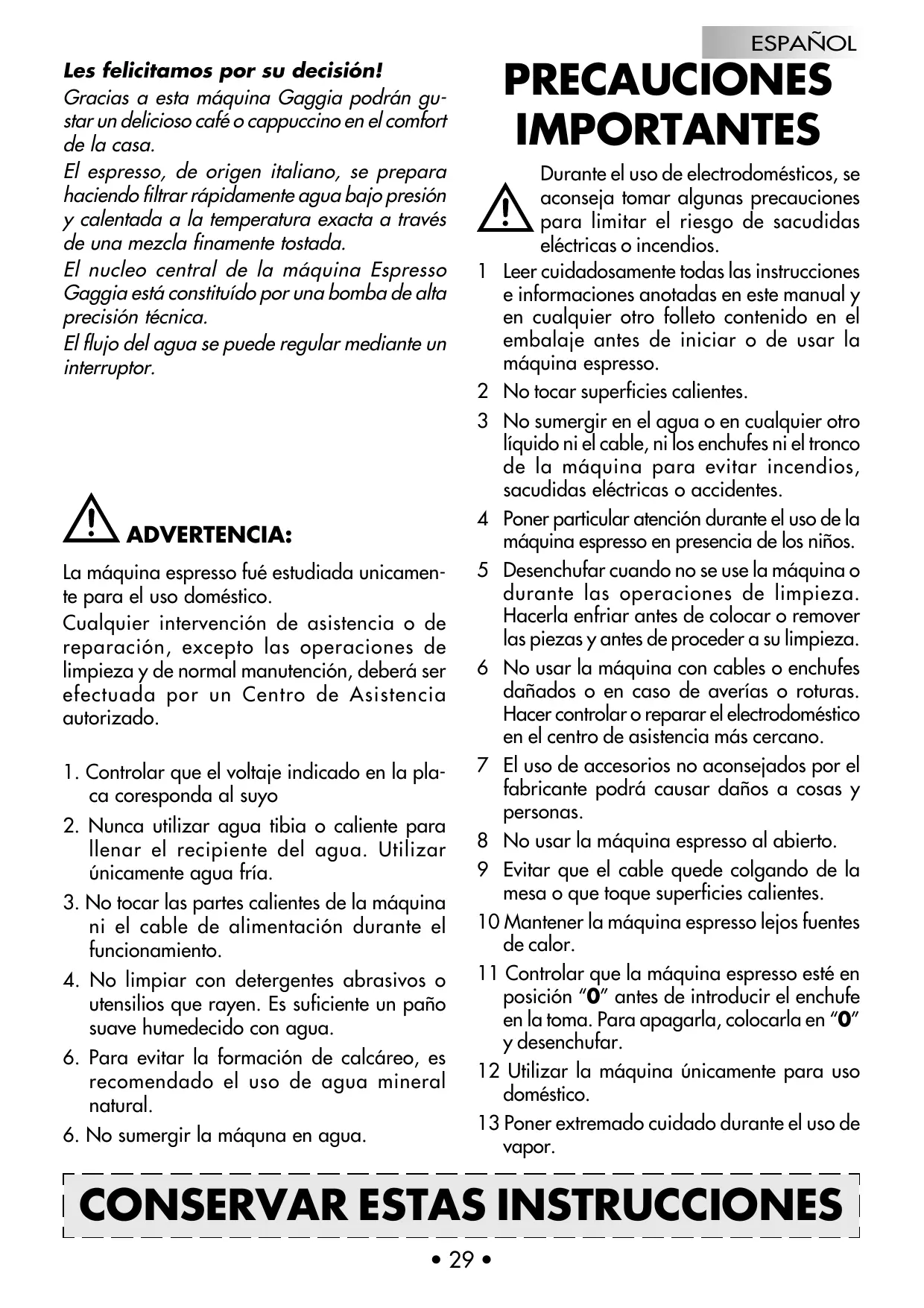 ESPAÑOL Les felicitamos por su decisión! Gracias a esta máquina Gaggia podrán gustar un delicioso café o cappuccino en el comfort de la casa. El espresso, de origen italiano, se prepara haciendo filtrar rápidamente agua bajo presión y calentada a la temperatura exacta a través de una mezcla finamente tostada. El nucleo central de la máquina Espresso Gaggia está constituído por una bomba de alta precisión técnica. El flujo del agua se puede regular mediante un interruptor.