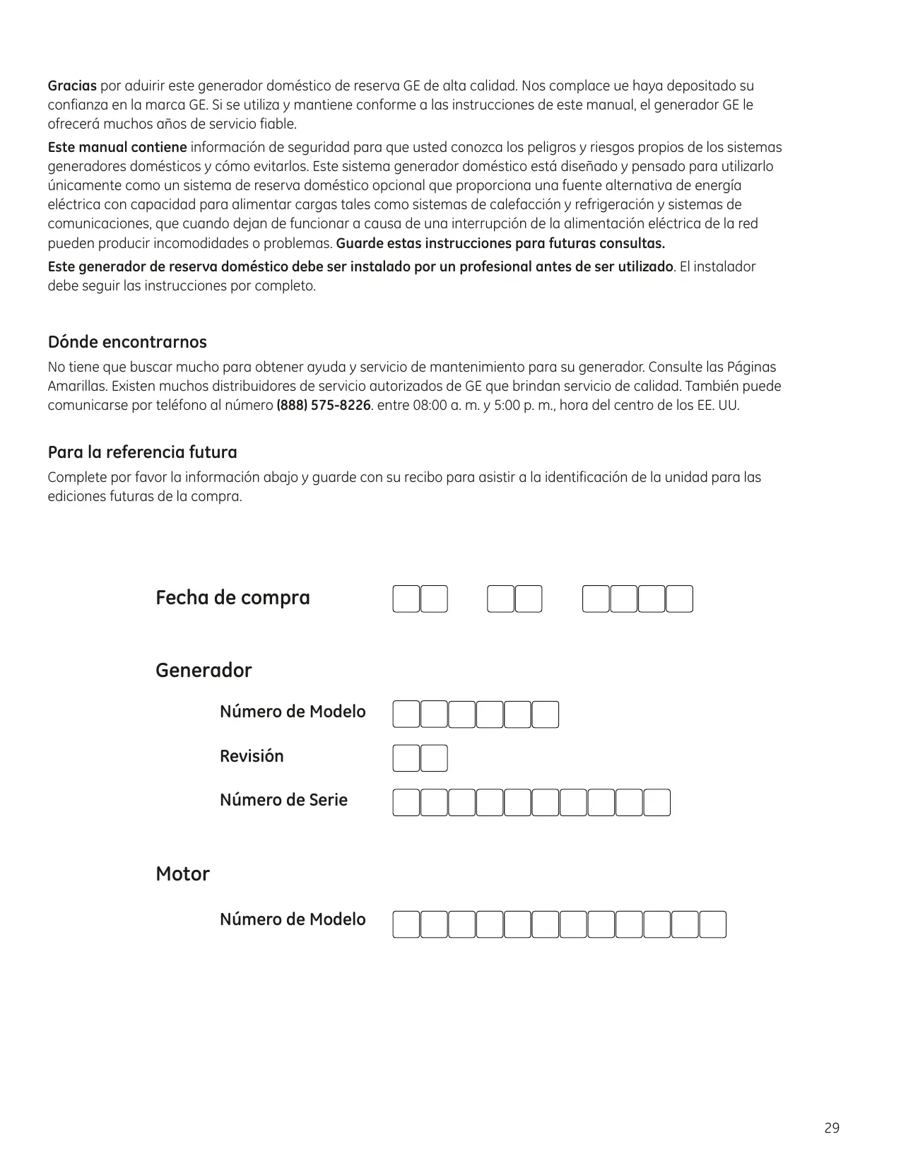 GE Home Generator Systems 7,000 vaitos Sistema generador doméstico Manual de instalación y arranque Gracias por aduirir este generador doméstico de reserva GE de alta calidad. Nos complace ue haya depositado su confianza en la marca GE. Si se utiliza y mantiene conforme a las instrucciones de este manual, el generador GE le ofrecerá muchos años de servicio fiable. Este manual contiene información de seguridad para que usted conozca los peligros y riesgos propios de los sistemas generadores domésticos y cómo evitarlos. Este sistema generador doméstico está diseñado y pensado para utilizarlo únicamente como un sistema de reserva doméstico opcional que proporciona una fuente alternativa de energía eléctrica con capacidad para alimentar cargas tales como sistemas de calefacción y refrigeración y sistemas de comunicaciones, que cuando dejan de funcionar a causa de una interrupción de la alimentación eléctrica de la red pueden producir incomodidades o problemas. Guarde estas instrucciones para futuras consultas. Este generador de reserva doméstico debe ser instalado por un profesional antes de ser utilizado. El instalador debe seguir las instrucciones por completo. Dónde encontrarnos No tiene que buscar mucho para obtener ayuda y servicio de mantenimiento para su generador. Consulte las Páginas Amarillas. Existen muchos distribuidores de servicio autorizados de GE que brindan servicio de calidad. También puede comunicarse por teléfono al número (888) 575-8226. entre 08:00 a. m. y 5:00 p. m., hora del centro de los EE. UU. Para la referencia futura Complete por favor la información abajo y guarde con su recibo para asistir a la identificación de la unidad para las ediciones futuras de la compra. Fecha de compra Generador Número de Modelo Revisión Número de Serie Motor Número de Modelo