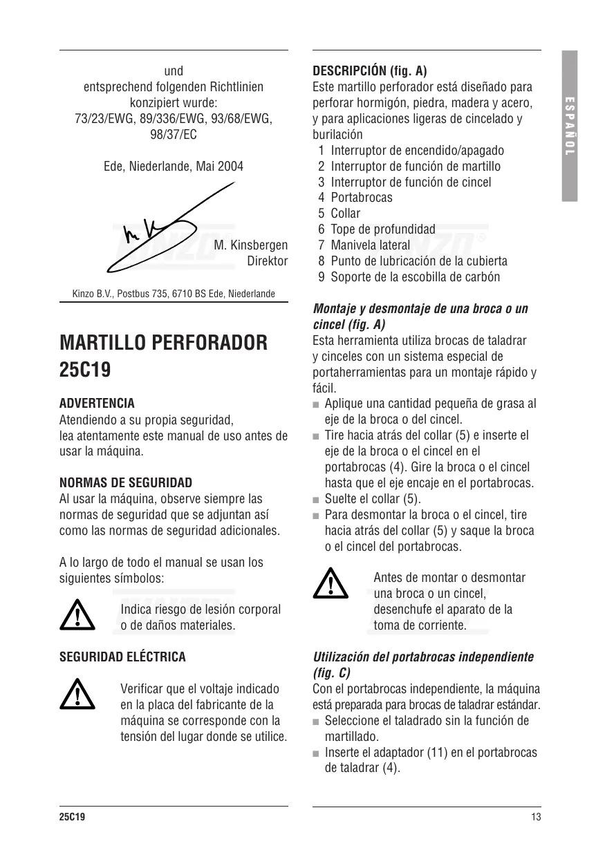 Kinzo B.V. declara que las máquinas: Martillo perforador 25C19 han sido diseñadas de acuerdo con las siguientes normas: EN 55014-1, EN 55014-2, EN 50144-1, EN 50144-2-6,