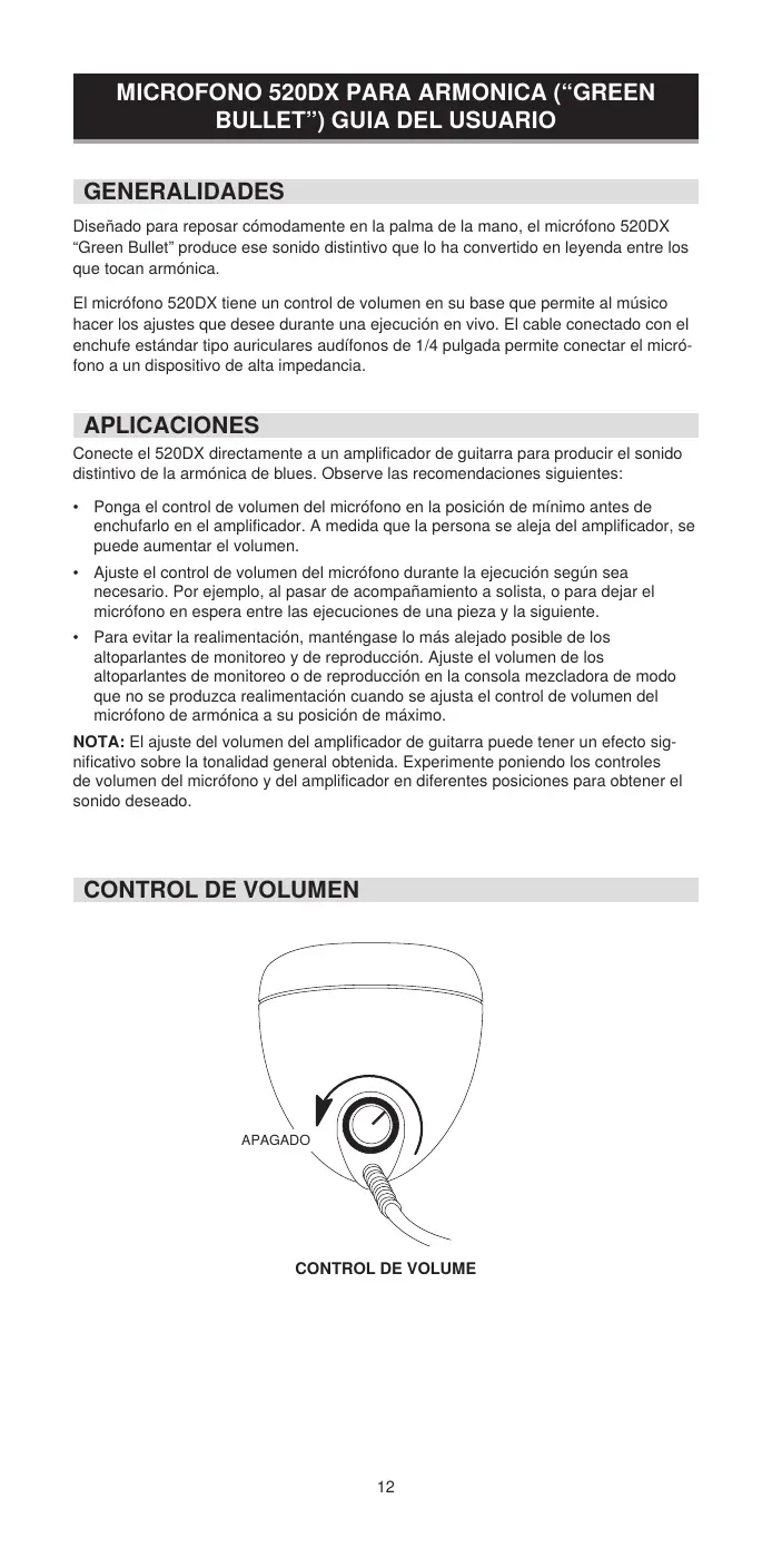 GENERALIDADES Diseñado para reposar cómodamente en la palma de la mano, el micrófono 520DX “Green Bullet” produce ese sonido distintivo que lo ha convertido en leyenda entre los que tocan armónica. El micrófono 520DX tiene un control de volumen en su base que permite al músico hacer los ajustes que desee durante una ejecución en vivo. El cable conectado con el enchufe estándar tipo auriculares audífonos de 1/4 pulgada permite conectar el micrófono a un dispositivo de alta impedancia. APLICACIONES Conecte el 520DX directamente a un amplificador de guitarra para producir el sonido distintivo de la armónica de blues. Observe las recomendaciones siguientes: