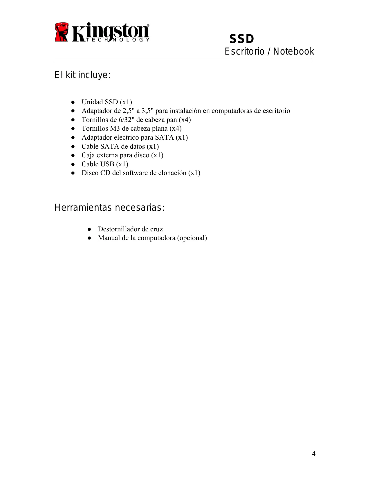 SSD Escritorio / Notebook Guía de instalación La compra de la unidad SSD con el kit de accesorios, le permitirá disfrutar de los beneficios de un mejor desempeño de la computadora y de mayor confiabilidad. El producto incluye todos los accesorios y el software necesario para reemplazar el disco duro de su computadora con la unidad Kingston SSD de estado sólido. El programa Acronis® True Image HD*, incluido con la unidad, es un programa de clonación y de copia de imágenes que lo guiará a través del proceso de clonación, es decir, la copia del contenido del disco duro de la computadora a otra unidad. Este software le permite trasladar el sistema operativo y la información personal contenida en el disco duro actual de su computadora, a su nueva unidad SSD. Una vez que el programa Acronis® True Image HD haya finalizado el proceso de clonación y que la información haya sido transferida correctamente a su unidad SSD, la unidad original se puede utilizar como disco secundario para el almacenamiento de información.