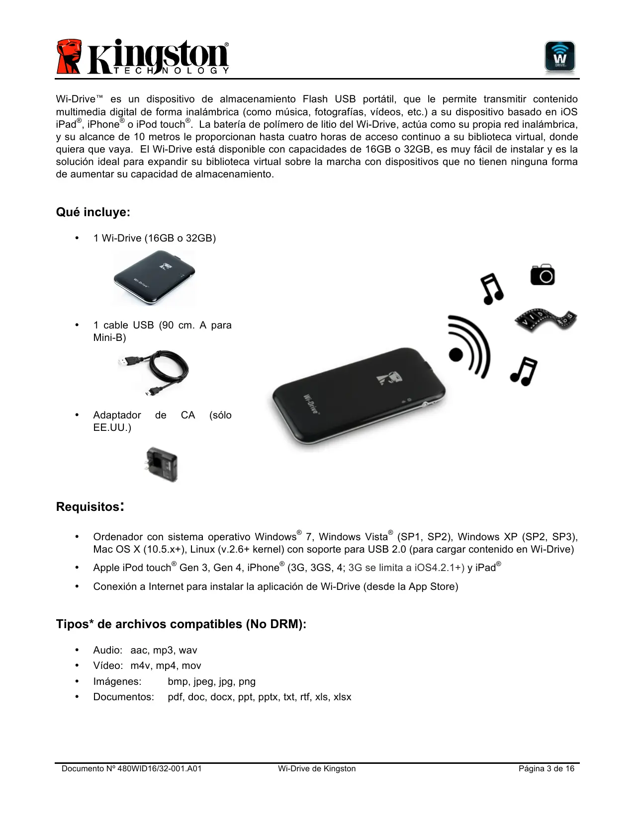 Wi-Drive™ es un dispositivo de almacenamiento Flash USB portátil, que le permite transmitir contenido multimedia digital de forma inalámbrica (como música, fotografías, vídeos, etc.) a su dispositivo basado en iOS