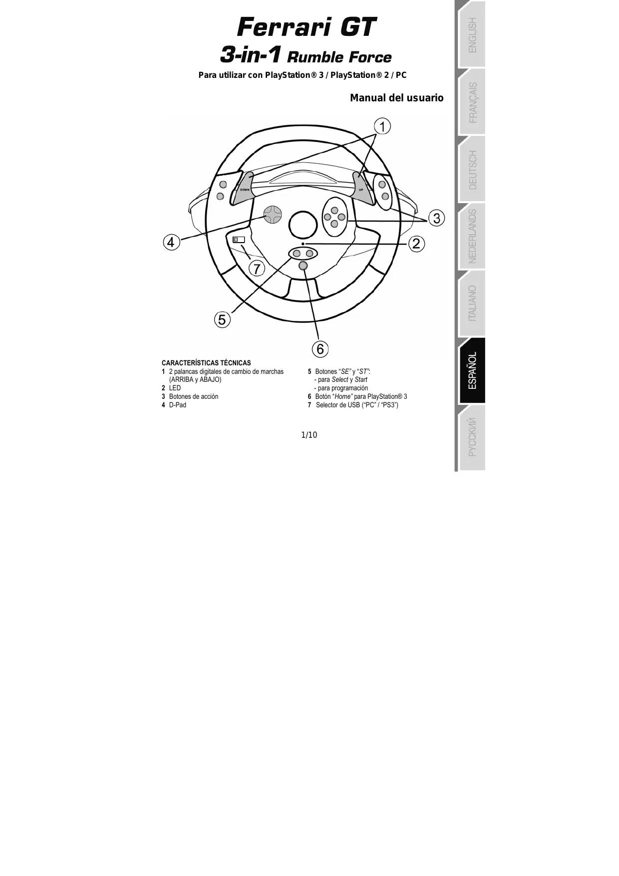 - El selector de USB (7) del volante debe estar siempre en la posición “PS3” antes de conectar el volante. - En modo “1 Jugador”: Si el gamepad oficial está encendido, tendrás que cambiarlo al “puerto de mando 2” para que el volante sea plenamente funcional. - En PlayStation® 3, el volante sólo es compatible con juegos de PlayStation® 3 (y no funcionará con juegos de PlayStation® 2). - En ciertos juegos de carreras, no dudes en probar los 2 modos de sensibilidad del volante para optimizar su precisión y receptividad. 3/10