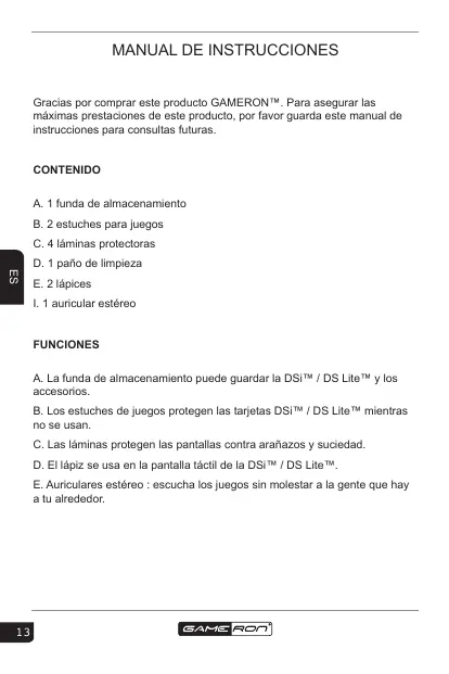 Gracias por comprar este producto GAMERON . Para asegurar las méximas prestaciones de este producte, por favor guarda este manual de instucciones para consuls fuuras. CONTEMDO À 1 funda de aimacanamiente B.2 estuches para juegos C4 lâminas protactoras D. 1 paño de impieza E:2lépices