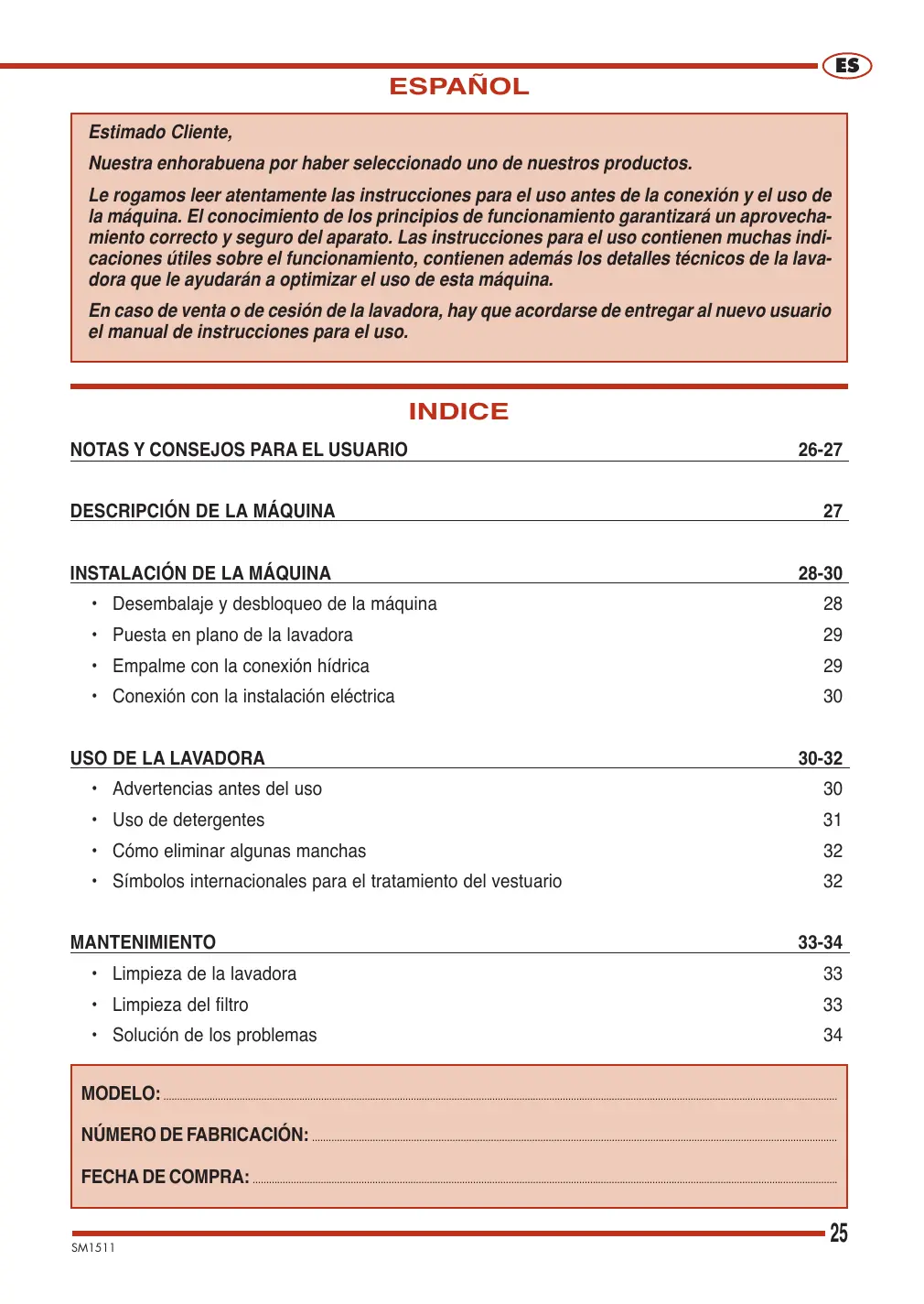 ESPAÑOL Estimado Cliente, Nuestra enhorabuena por haber seleccionado uno de nuestros productos. Le rogamos leer atentamente las instrucciones para el uso antes de la conexión y el uso de la máquina. El conocimiento de los principios de funcionamiento garantizará un aprovechamiento correcto y seguro del aparato. Las instrucciones para el uso contienen muchas indicaciones útiles sobre el funcionamiento, contienen además los detalles técnicos de la lavadora que le ayudarán a optimizar el uso de esta máquina. En caso de venta o de cesión de la lavadora, hay que acordarse de entregar al nuevo usuario el manual de instrucciones para el uso. INDICE