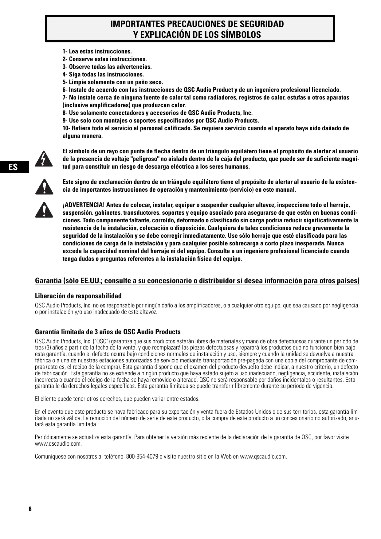 1- Lea estas instrucciones. 2- Conserve estas instrucciones. 3- Observe todas las advertencias. 4- Siga todas las instrucciones. 5- Limpie solamente con un paño seco. 6- Instale de acuerdo con las instrucciones de QSC Audio Product y de un ingeniero profesional licenciado. 7- No instale cerca de ninguna fuente de calor tal como radiadores, registros de calor, estufas u otros aparatos (inclusive amplificadores) que produzcan calor. 8- Use solamente conectadores y accesorios de QSC Audio Products, Inc. 9- Use solo con montajes o soportes especificados por QSC Audio Products. 10- Refiera todo el servicio al personal calificado. Se requiere servicio cuando el aparato haya sido dañado de alguna manera. El símbolo de un rayo con punta de flecha dentro de un triángulo equilátero tiene el propósito de alertar al usuario de la presencia de voltaje "peligroso" no aislado dentro de la caja del producto, que puede ser de suficiente magnitud para constituir un riesgo de descarga eléctrica a los seres humanos.