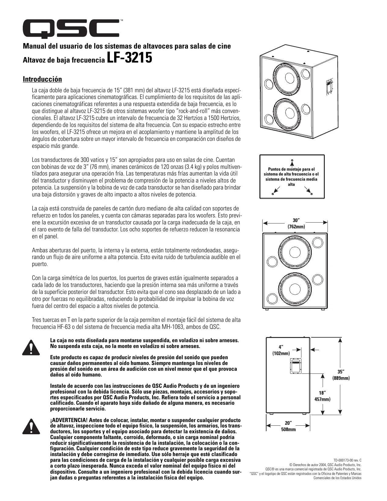 La caja no esta diseñada para montarse suspendida, en voladizo ni sobre arneses. No suspenda esta caja, no la monte en voladizo ni sobre arneses. Este producto es capaz de producir niveles de presión del sonido que pueden causar daños permanentes al oído humano. Siempre mantenga los niveles de presión del sonido en un área de audición con un nivel menor que el que provoca daños al oído humano. Instale de acuerdo con las instrucciones de QSC Audio Products y de un ingeniero profesional con la debida licencia. Sólo use piezas, montajes, accesorios y soportes especificados por QSC Audio Products, Inc. Refiera todo el servicio a personal calificado. Cuando el aparato haya sido dañado de alguna manera, es necesario proporcionarle servicio. ¡ADVERTENCIA! Antes de colocar, instalar, montar o suspender cualquier producto de altavoz, inspeccione todo el equipo físico, la suspensión, los armarios, los transductores, los soportes y el equipo asociado para detectar la existencia de daños. Cualquier componente faltante, corroído, deformado, o sin carga nominal podría reducir significativamente la resistencia de la instalación, la colocación o la configuración. Cualquier condición de este tipo reduce gravemente la seguridad de la instalación y debe corregirse de inmediato. Use sólo herraje que esté clasificado para las condiciones de carga de la instalación y cualquier posible carga excesiva a corto plazo inesperada. Nunca exceda el valor nominal del equipo físico ni del dispositivo. Consulte a un ingeniero profesional con la debida licencia cuando surjan dudas o preguntas referentes a la instalación física del equipo.