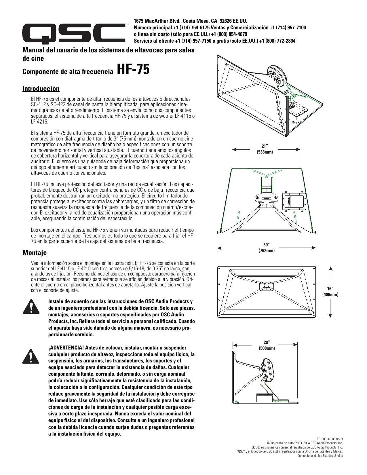 Vea la información sobre el montaje en la ilustración. El HF-75 se conecta en la parte superior del LF-4115 o LF-4215 con tres pernos de 5/16-18, de 0.75” de largo, con arandelas de fijación. Recomendamos el uso de un compuesto duradero para fijación de roscas al instalar los pernos para evitar que se aflojen debido a la vibración. Oriente el cuerno en el plano horizontal antes de apretarlo. Ajuste la posición vertical con el soporte de ajuste. Instale de acuerdo con las instrucciones de QSC Audio Products y de un ingeniero profesional con la debida licencia. Sólo use piezas, montajes, accesorios o soportes especificados por QSC Audio Products, Inc. Refiera todo el servicio a personal calificado. Cuando el aparato haya sido dañado de alguna manera, es necesario proporcionarle servicio. ¡ADVERTENCIA! Antes de colocar, instalar, montar o suspender cualquier producto de altavoz, inspeccione todo el equipo físico, la suspensión, los armarios, los transductores, los soportes y el equipo asociado para detectar la existencia de daños. Cualquier componente faltante, corroído, deformado, o sin carga nominal podría reducir significativamente la resistencia de la instalación, la colocación o la configuración. Cualquier condición de este tipo reduce gravemente la seguridad de la instalación y debe corregirse de inmediato. Use sólo herraje que esté clasificado para las condiciones de carga de la instalación y cualquier posible carga excesiva a corto plazo inesperada. Nunca exceda el valor nominal del equipo físico ni del dispositivo. Consulte a un ingeniero profesional con la debida licencia cuando surjan dudas o preguntas referentes a la instalación física del equipo. TD-000149-00 rev.D © Derechos de autor 2003, 2004 QSC Audio Products, Inc. QSC® es una marca comercial registrada de QSC Audio Products, Inc. “QSC” y el logotipo de QSC están registrados con la Oficina de Patentes y Marcas Comerciales de los Estados Unidos